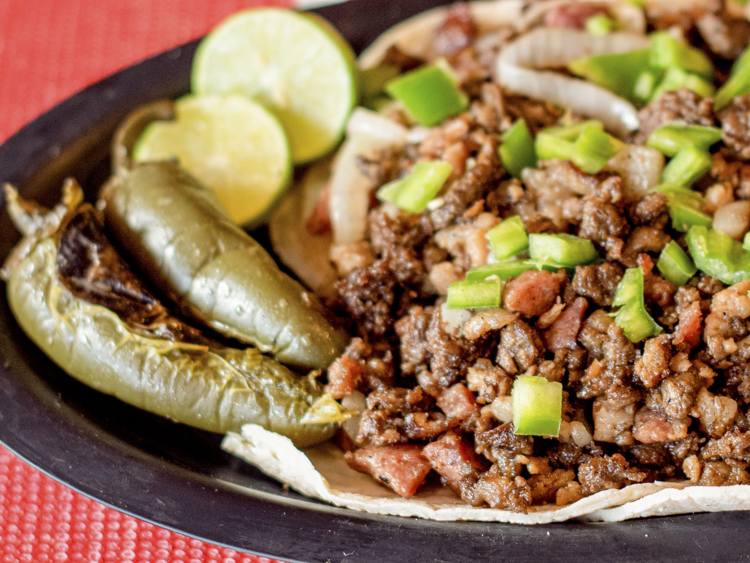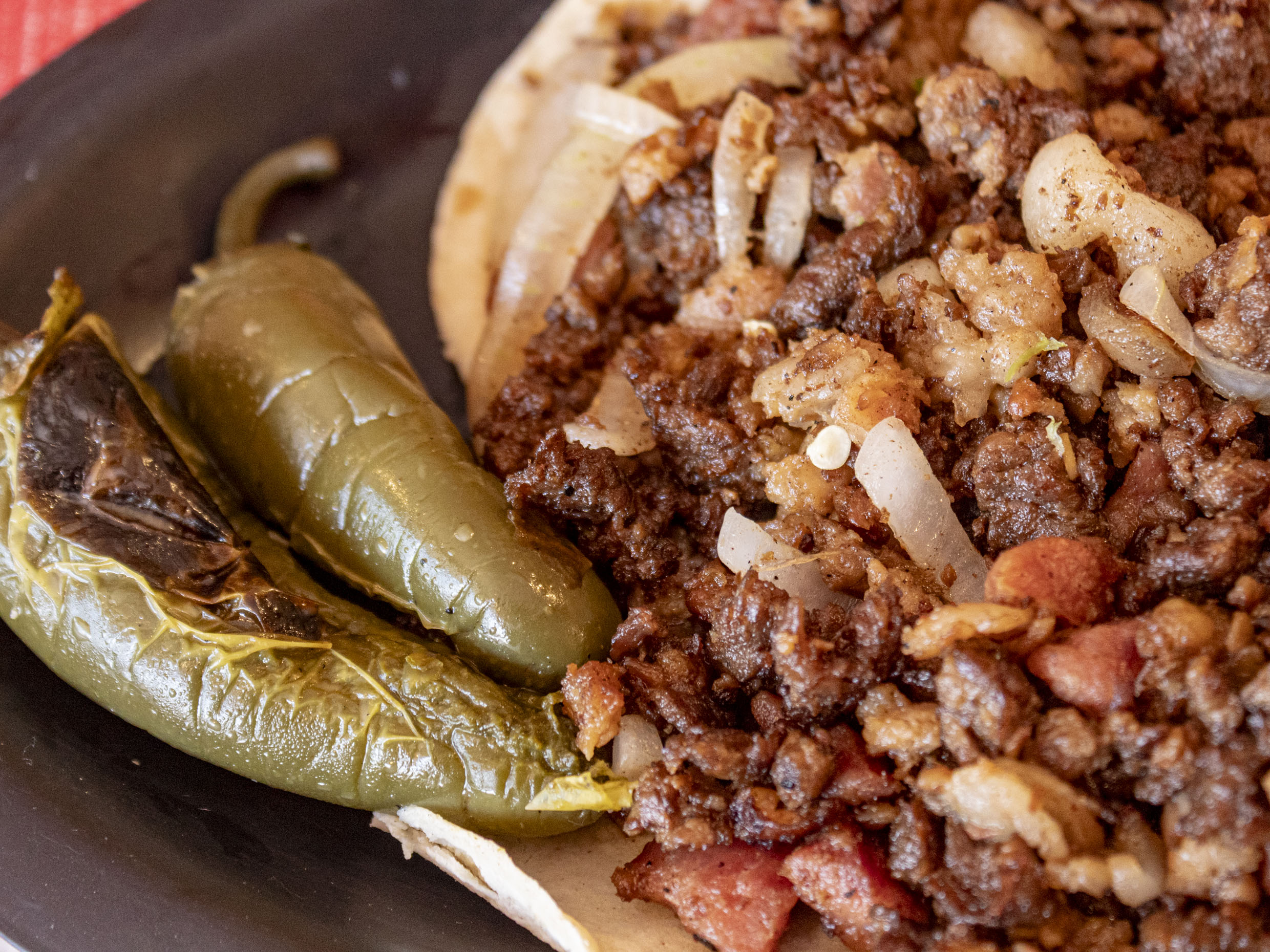 Pan arabe + queso + sirloin asado + tocino + champiñones + chilaca + cebolla + lechuga + tomate + aguacate + frijoles + tripitas.