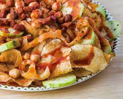 Papas Fritas acompanadas con cacahuate, pepino y rielitos, bamadas en salsas negras, valentina y limonn