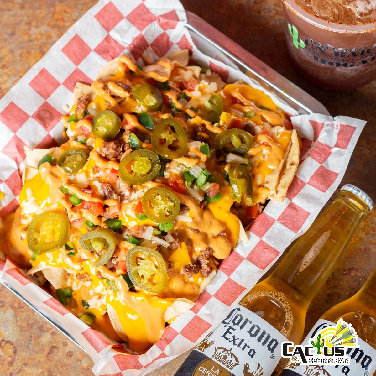 Totopos bañados en queso amarillo, pico de gallo, frijoles, queso tipo Chester y con crema de chipotle.