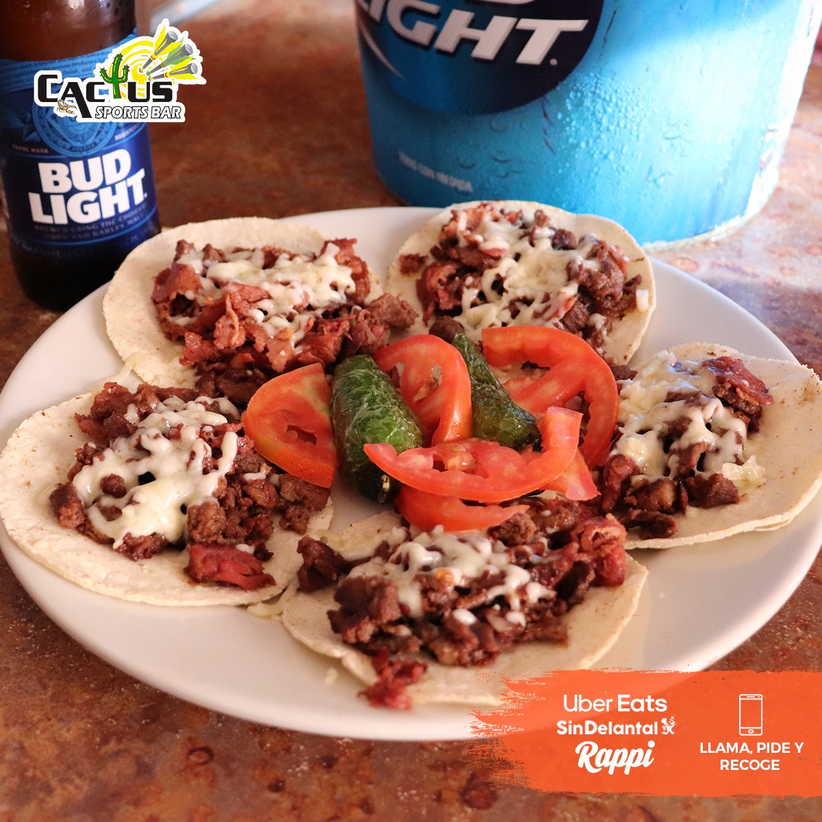 5 Deliciosos tacos de bistec con chorizo y tocino, gratinados con queso tipo chester, acompañado de ensalada.