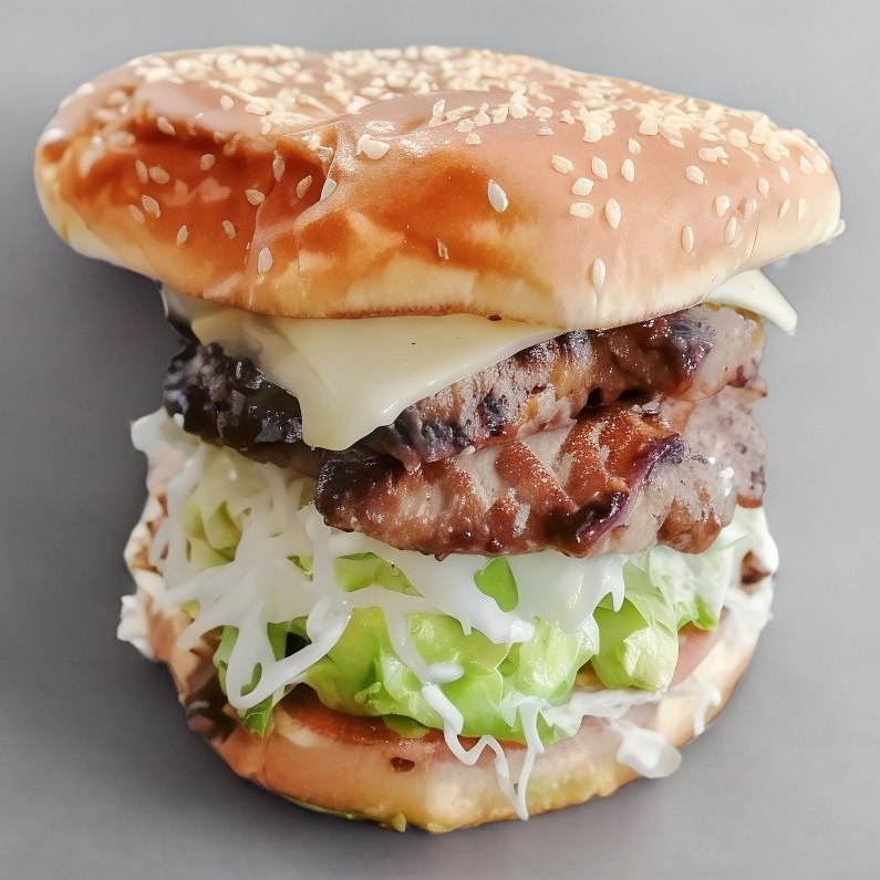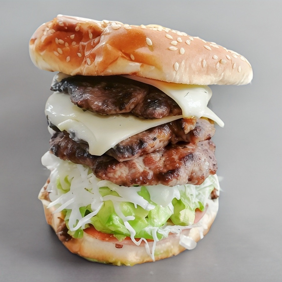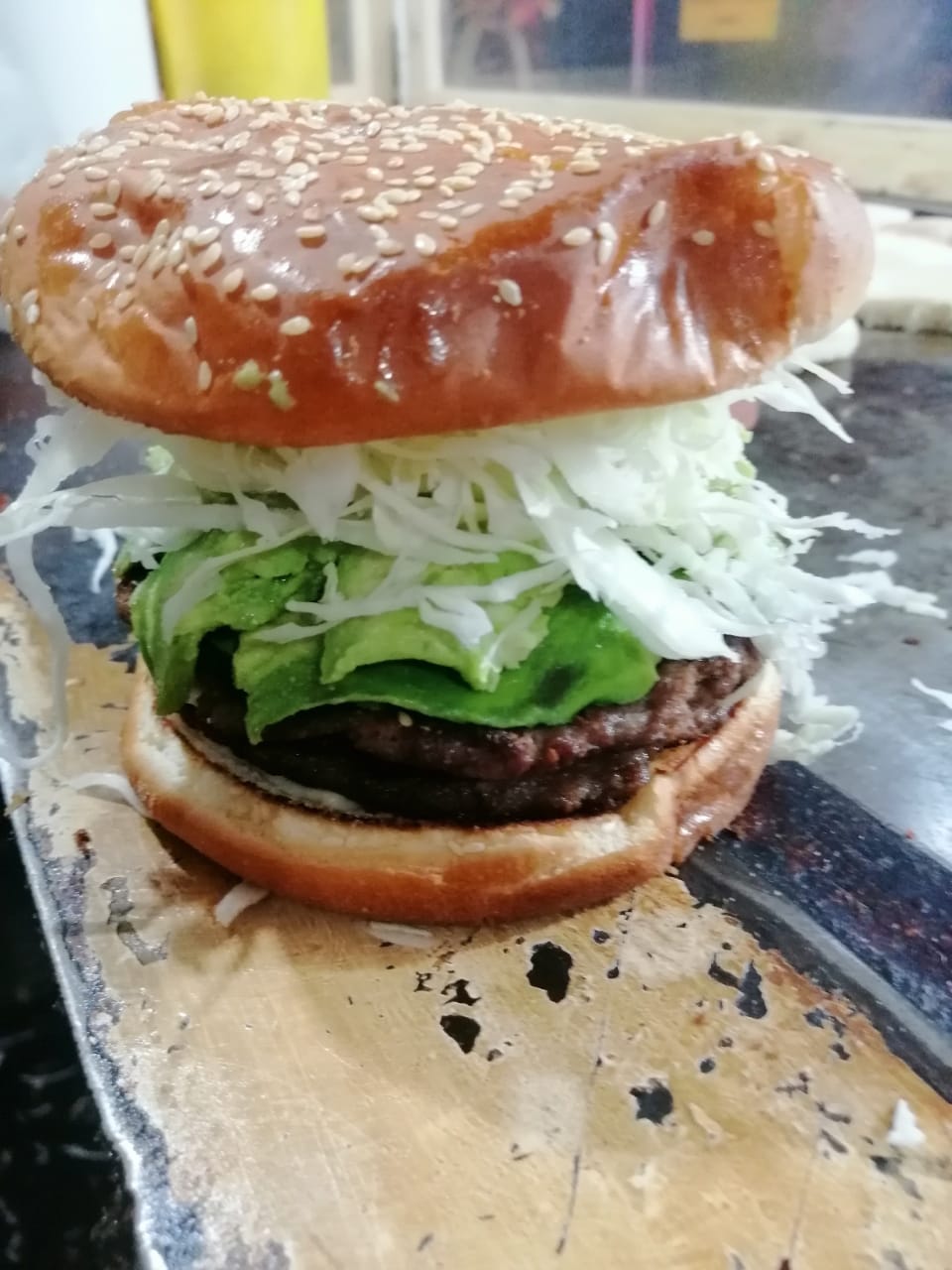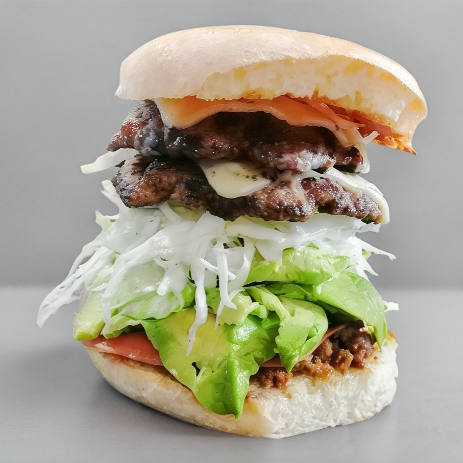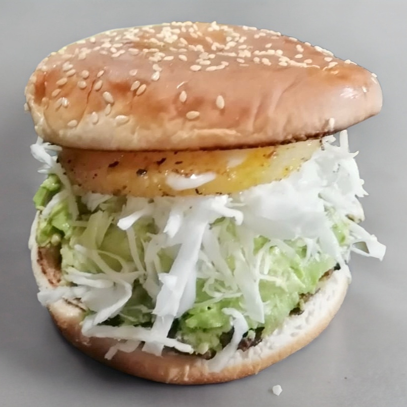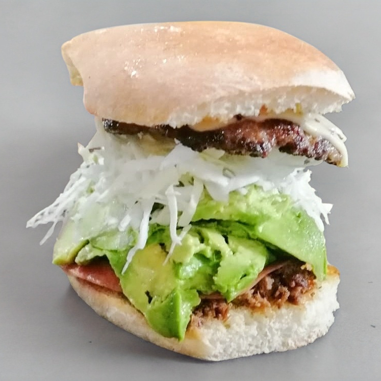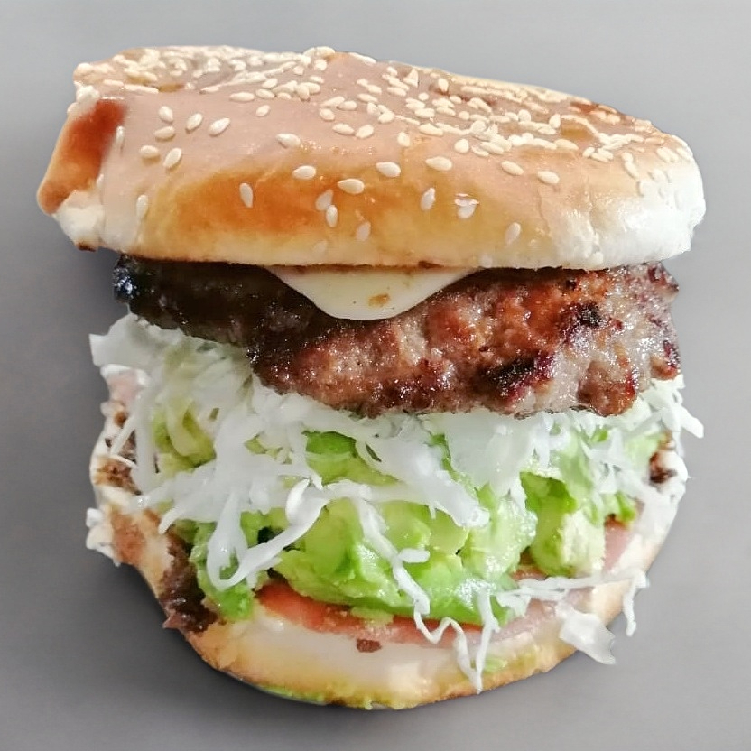 2 Carnes de hamburguesa, queso, lomo, jamón, aguacate, verdura y aderezos.