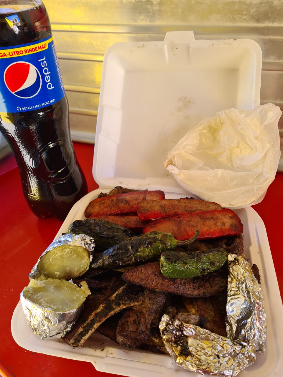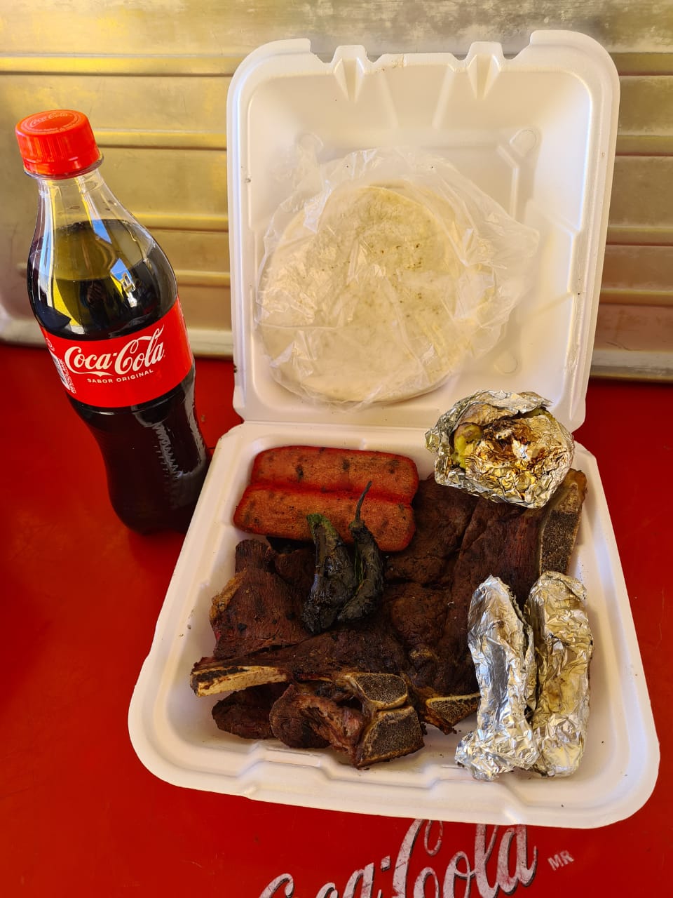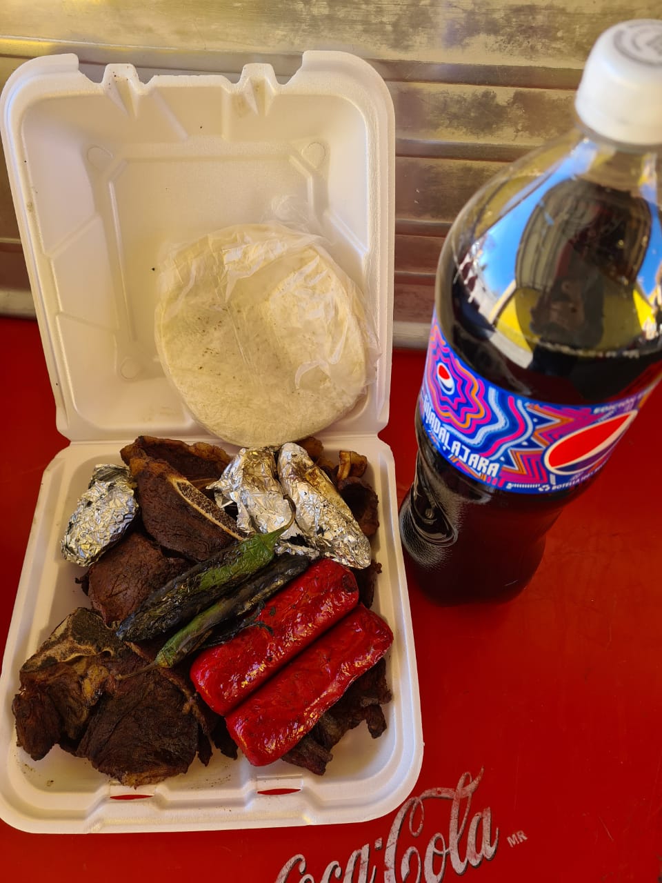 1 Kg 1/2 de carne asada, 2 salchichas, refresco de 1.5LT. Incluye 7 tortillas, cebollitas, toreados y 1 papita asada.