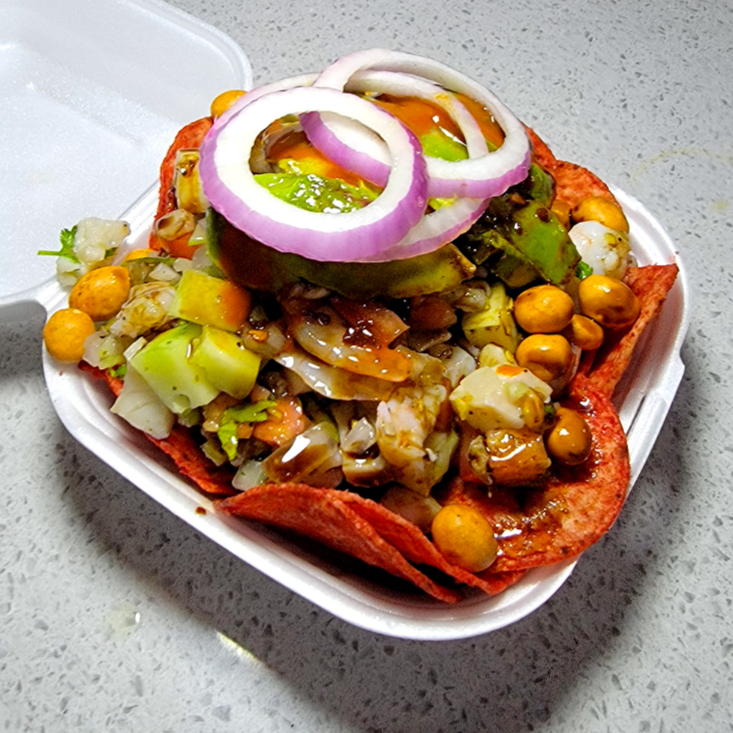 Cebolla, cilantro, tomate, apio, pepino, aguacate y ceviche de pescado. Acompañado con totopos. Especificar si lo quiere salseado.