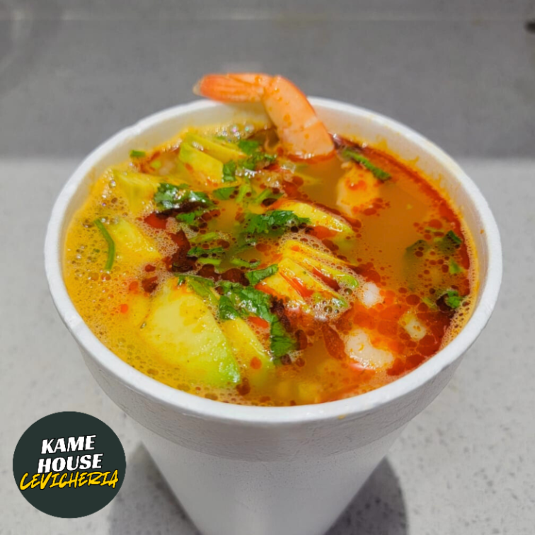 Servido en vaso de 20oz. Camarón curtido en limon, cebolla morada, cilantro, pepino, aguacate, chiltepin. Acompañado con totopos.