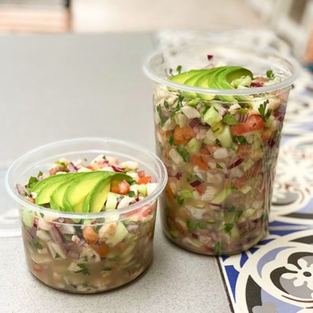 Servido en vaso de 16oz. Cebolla, cilantro, apio, pepino, aguacate y ceviche de pescado. Acompañado con totopos.