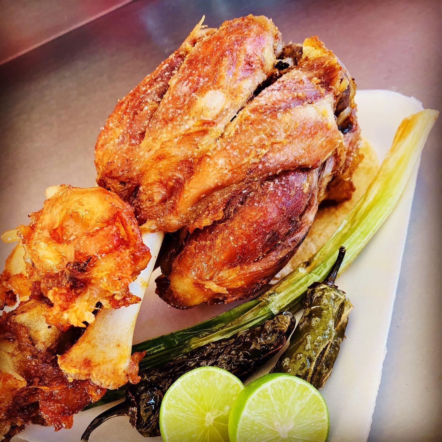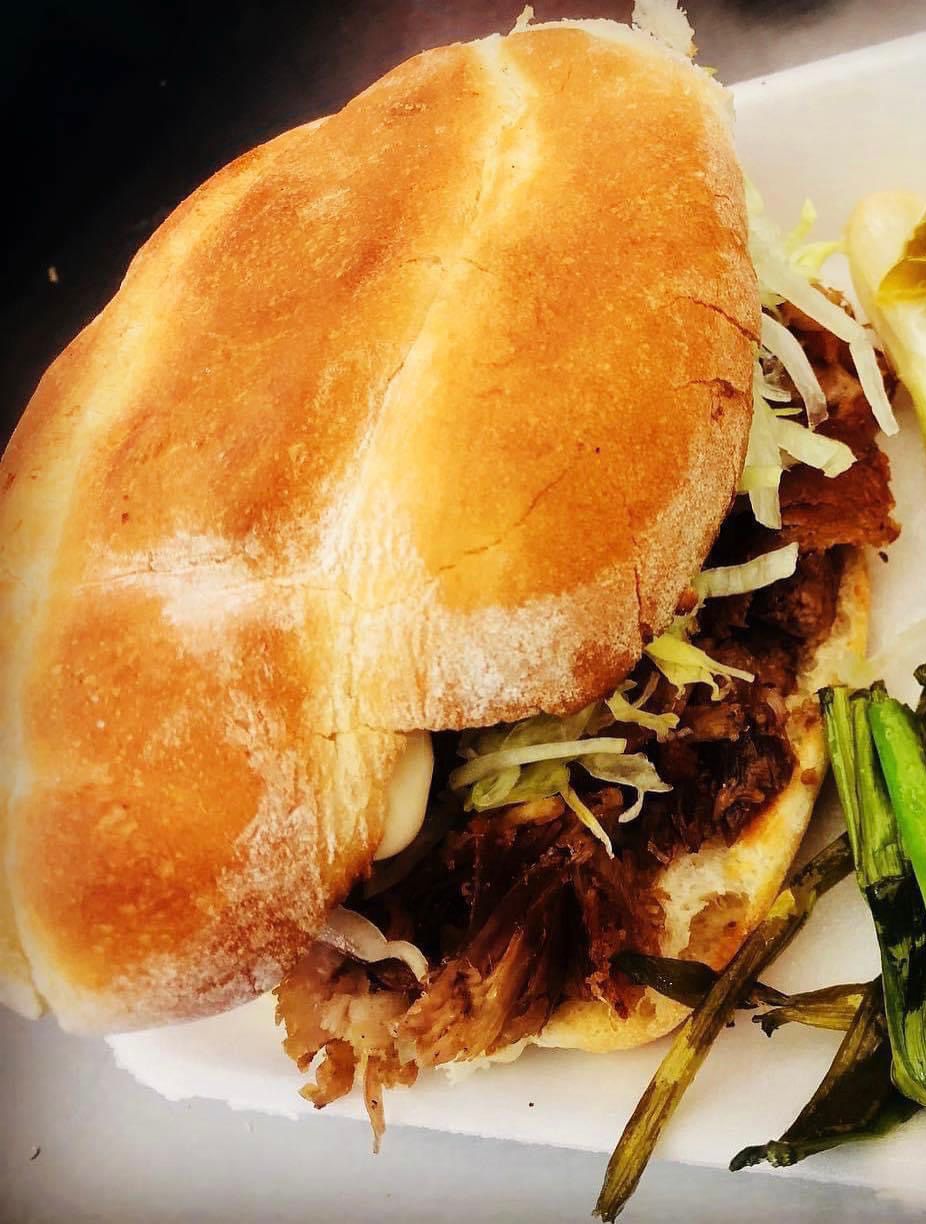 Carne de chamorro, aguacate, mayonesa, lechuga, tomate y salsa verde.