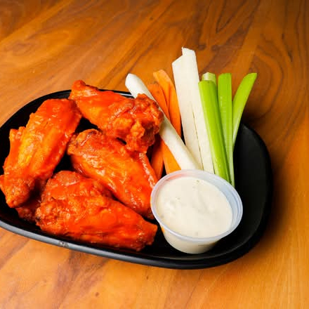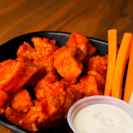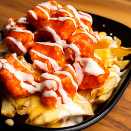 Crujientes aros de cebolla, acompañados de queso y verduras.