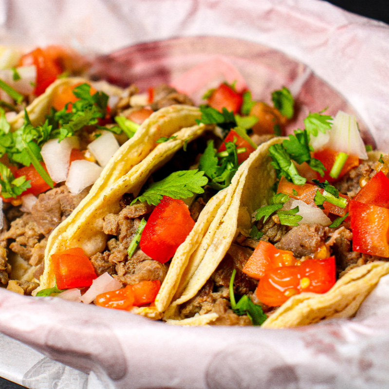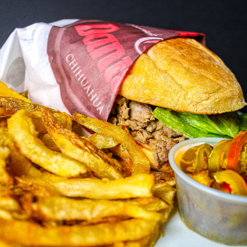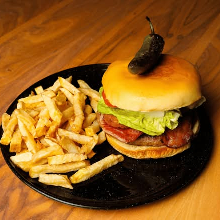 Deliciosa hamburguesa con papas a la francesa, lechuga, tomate, aros de cebolla y tocino.