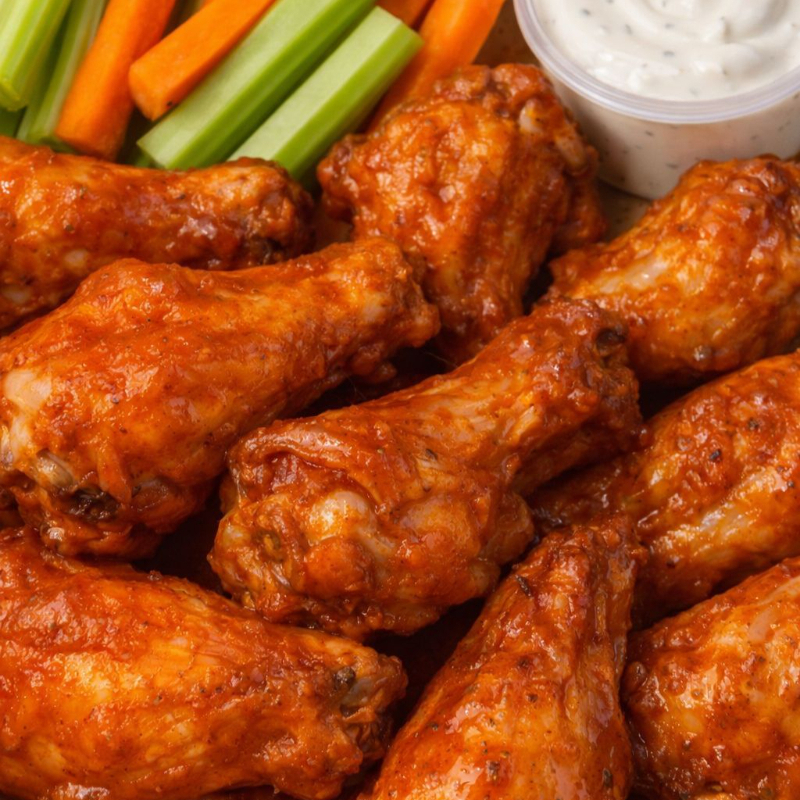 Orden individual de alitas bañadas en salsa de tu eleccion. incluye ranch y verduras.