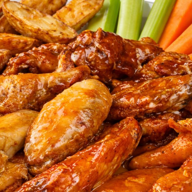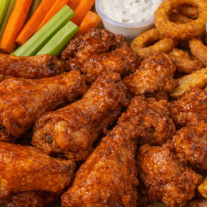Orden individual de alitas en salsa de tu eleccion + papas / aros de cebolla+ refresco. incluye ranch y verduras