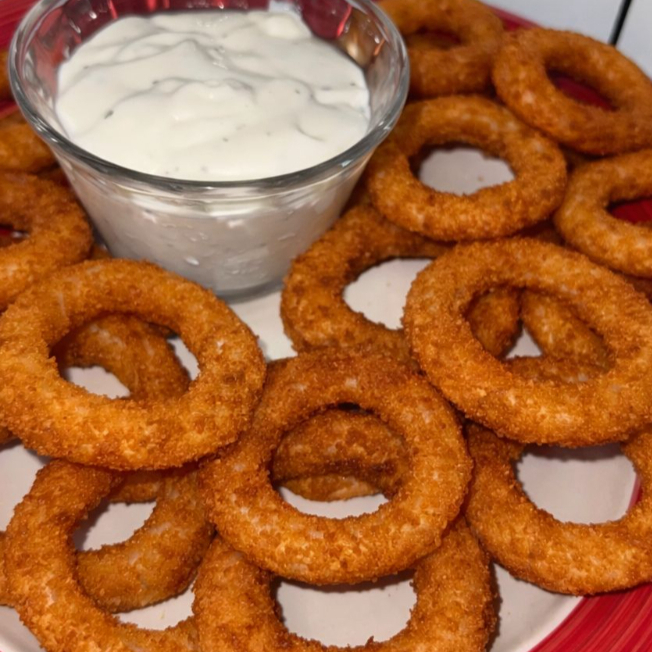 deliciosos aros de cebolla crujientes, acompañados de delicioso aderezo ranch