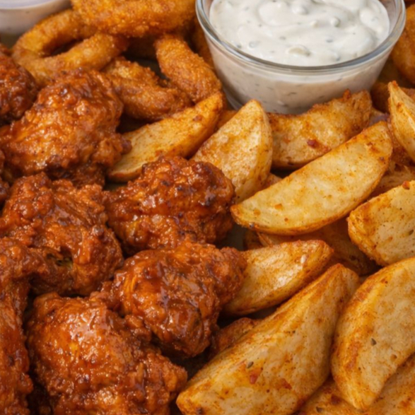 500grs de boneless + 500 grs alitas, dos salsas a elegir + papas + aros de cebolla