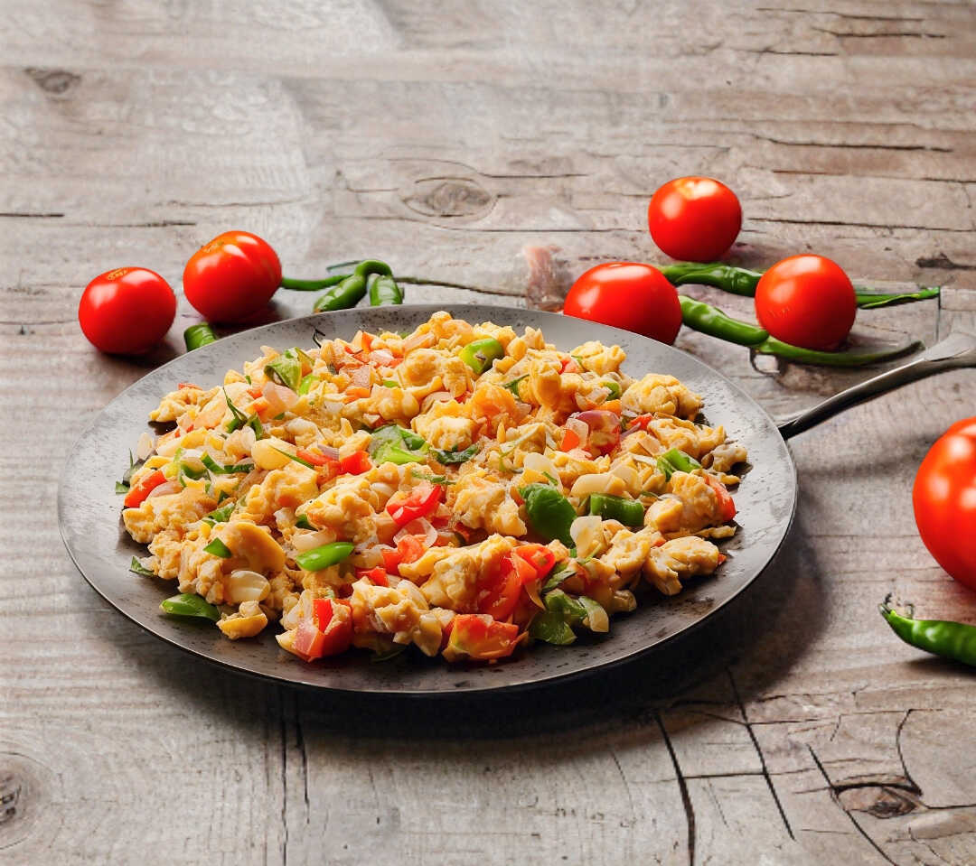 2 huevos revueltos con chile, tomate y cebolla acompañados de papas francesas, frijolitos y pan tostado o tortillas.