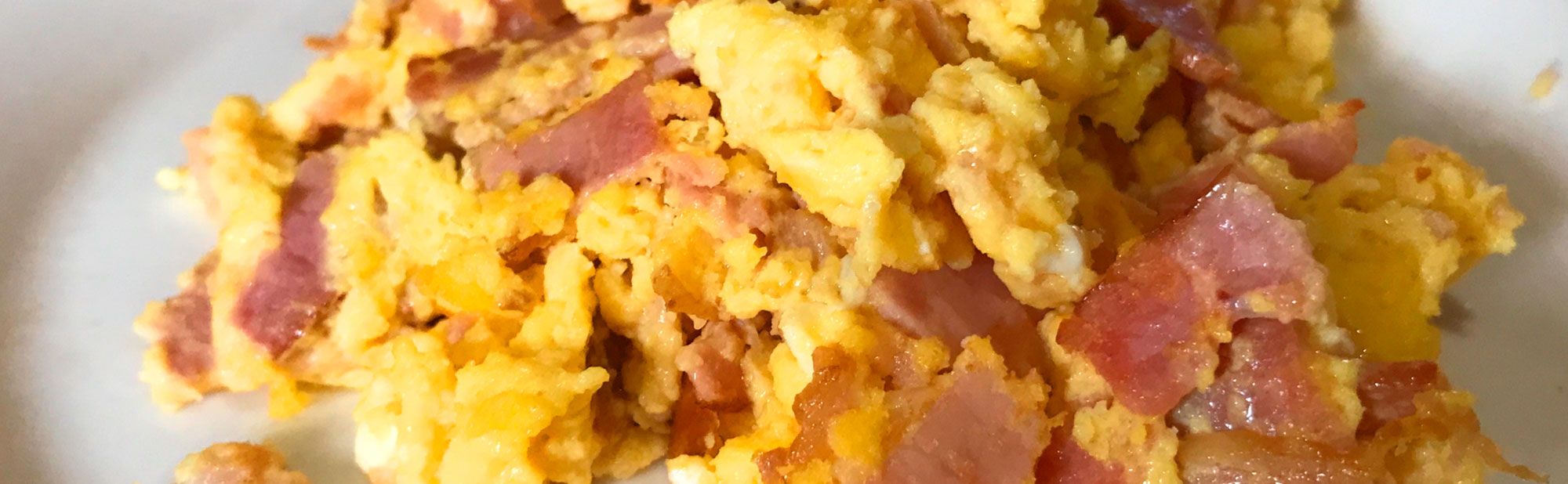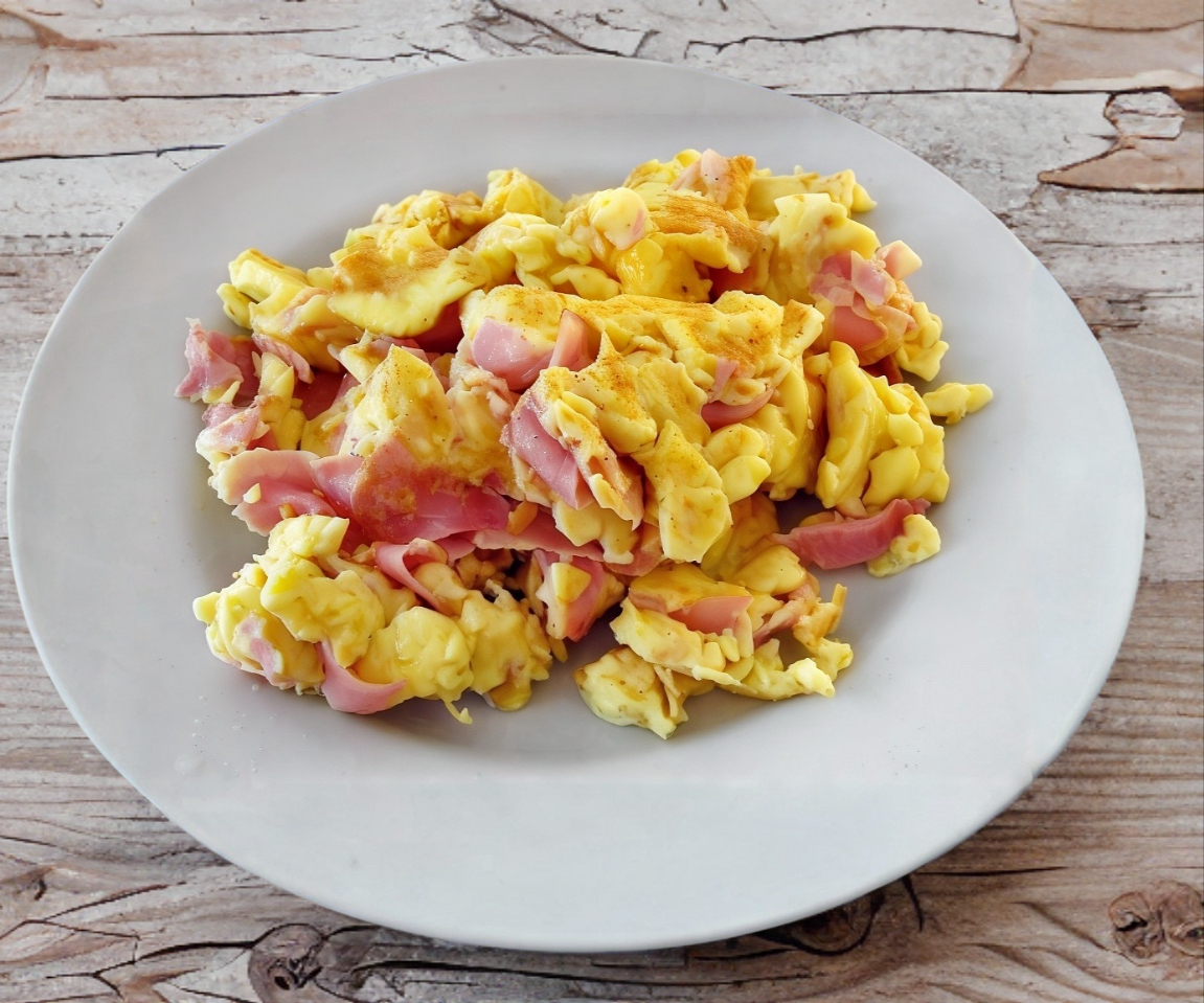2 huevos estrellados o revueltos con jamón acompañados de papas francesas, frijolitos y pan tostado o tortillas.