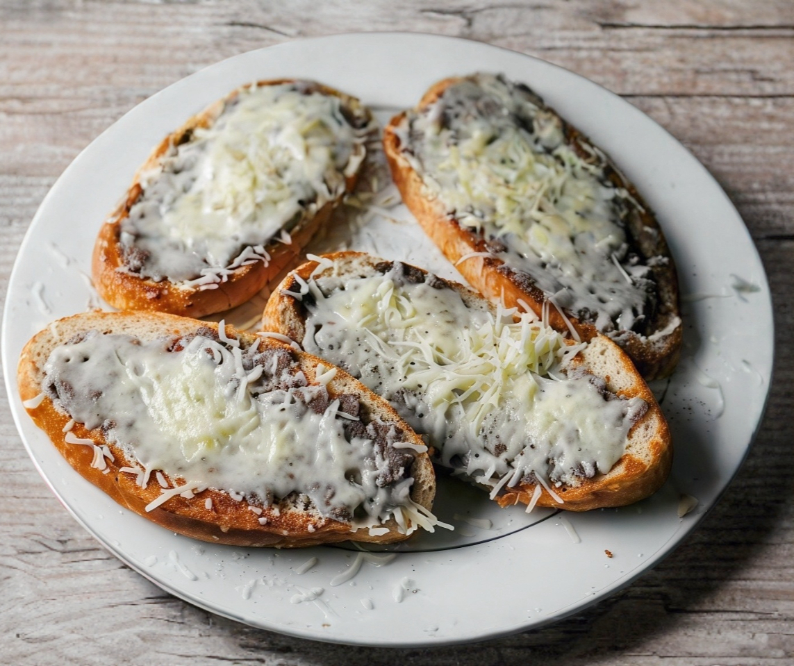 4 piezas de pan tostado con frijoles y queso menonita gratinado encima.