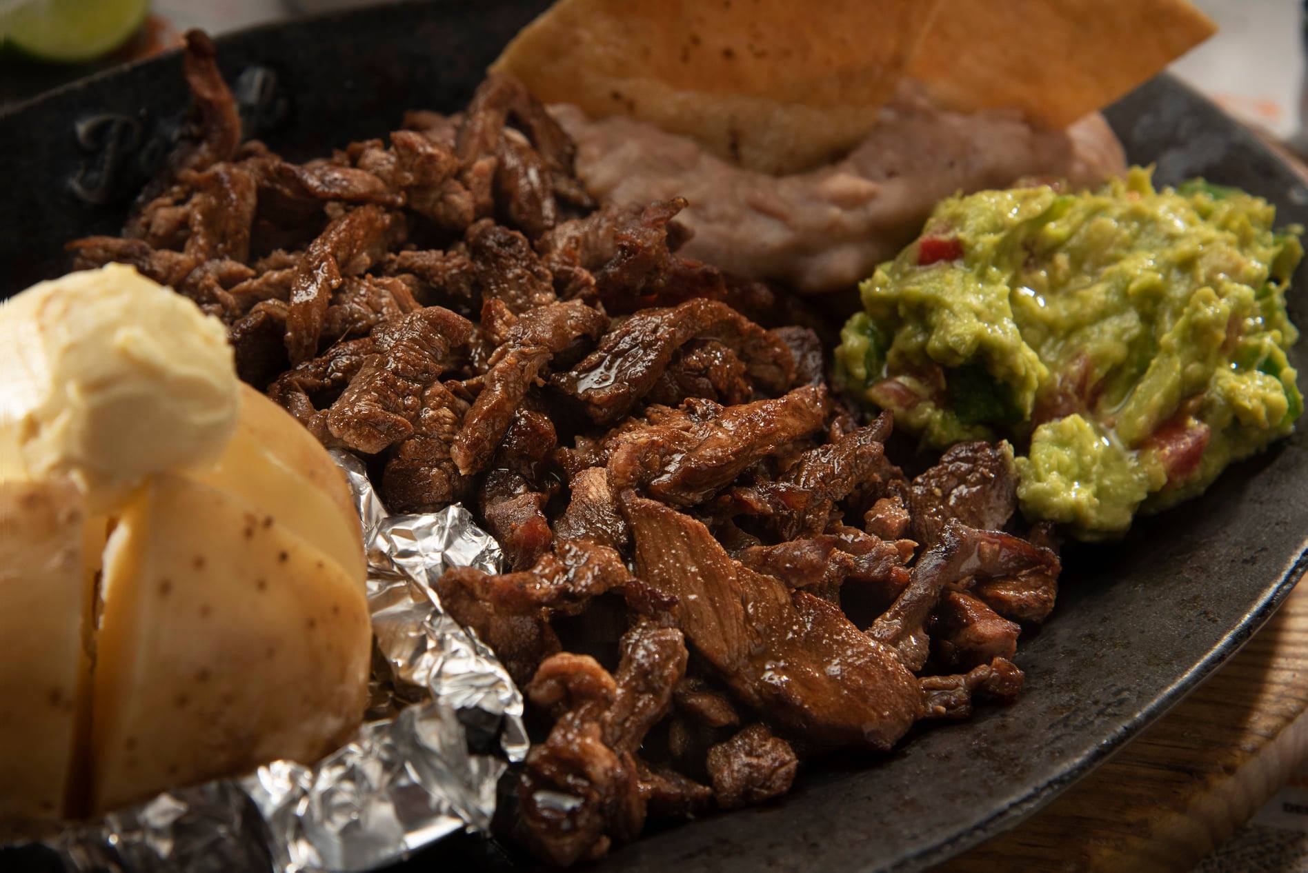 Tiritas de carne de res sazonadas con especias acompañadas de una rica papa asada, frijoles, guacamole, tortillas y sabroso consomé de res.