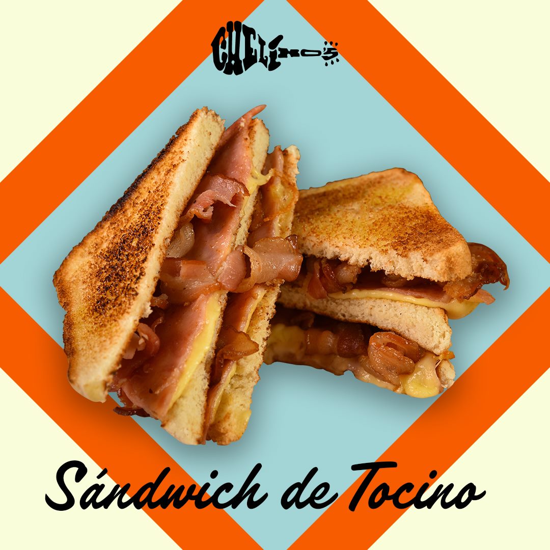 Se sirve en dos pisos (Tres rebanadas de pan de caja con jamón, queso, tocino, mayonesa y mostaza).