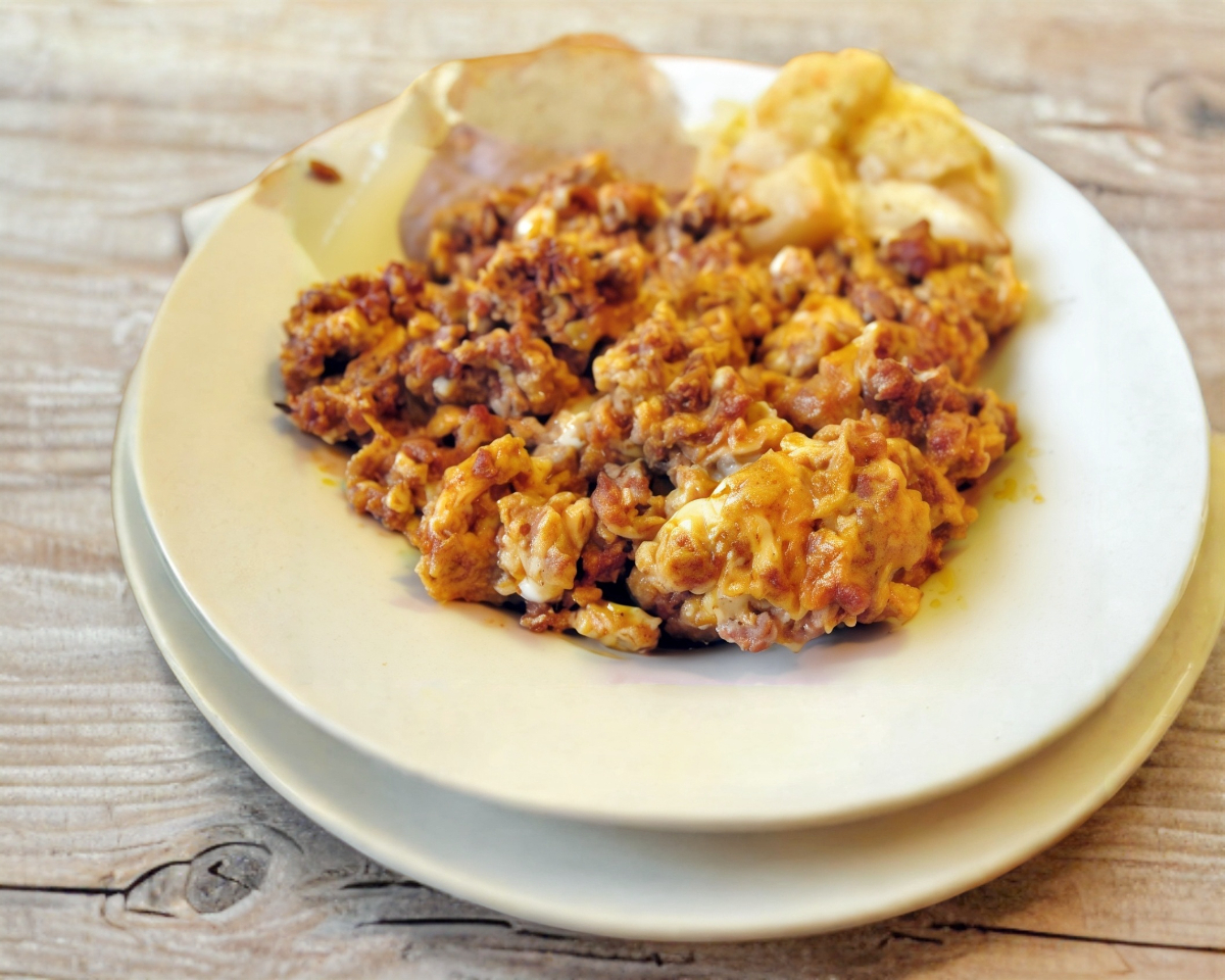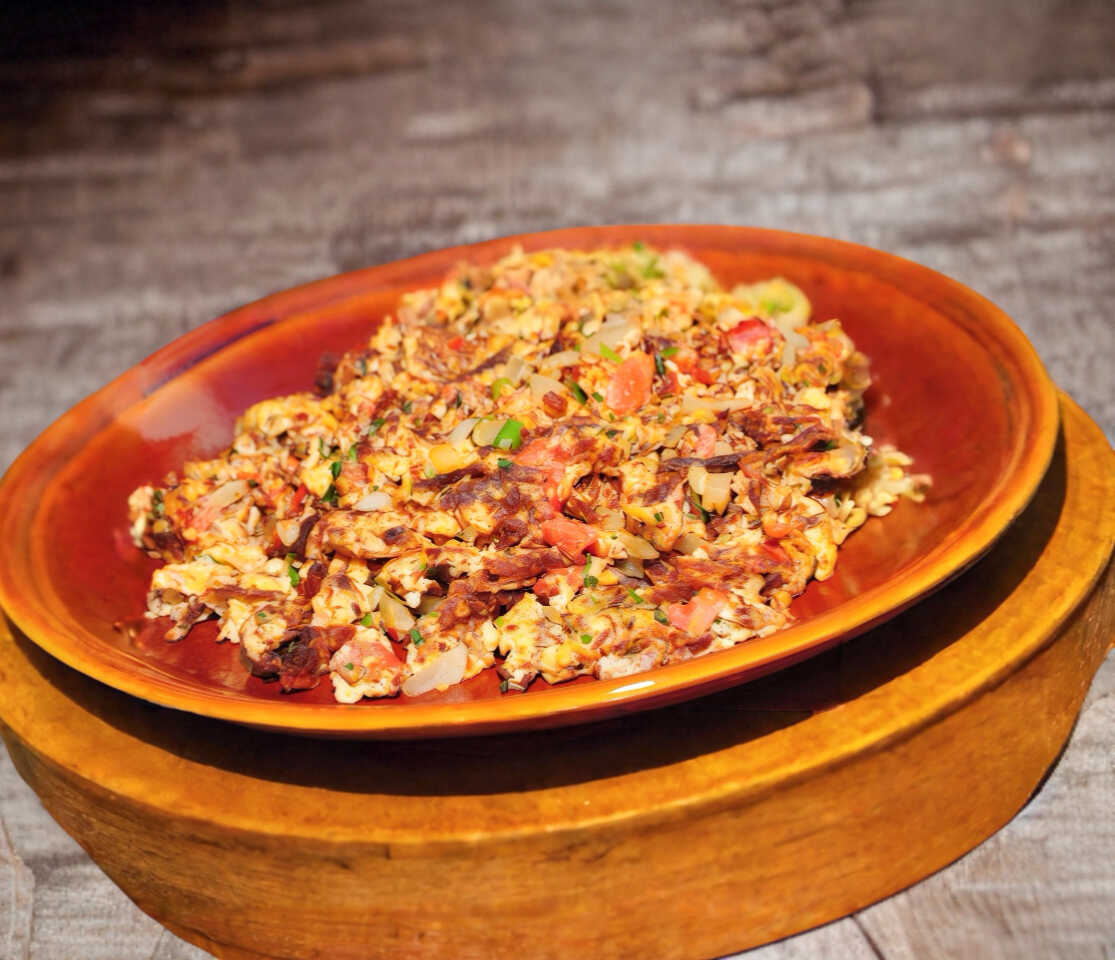 Huevos revueltos con carne seca, chile y tomate y cebolla acompañados de frijoles y pan tostado o tortillas de maíz o harina.