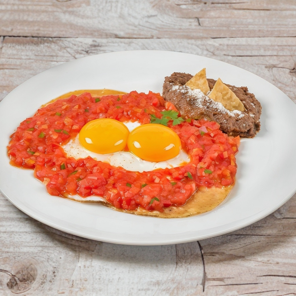 2 huevos estrellados sobre tortilla de maíz bañados con salsa ranchera, acompañados de papas francesas, frijolitos y pan tostado.