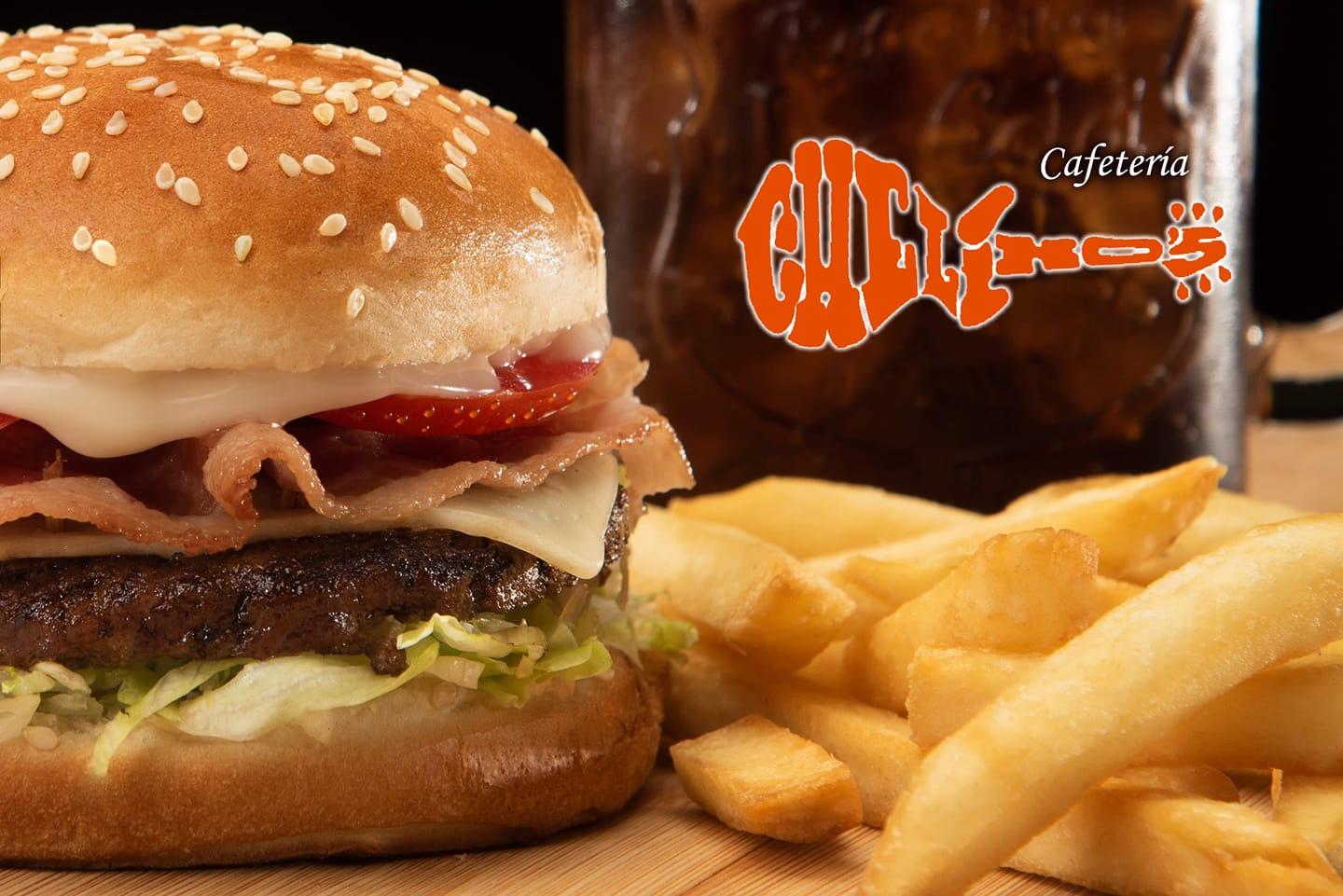 160 grs. de carne molida de pierna con queso menonita o queso asadero, lleva lechuga, tomate, y mayonesa, mostaza y catsup.