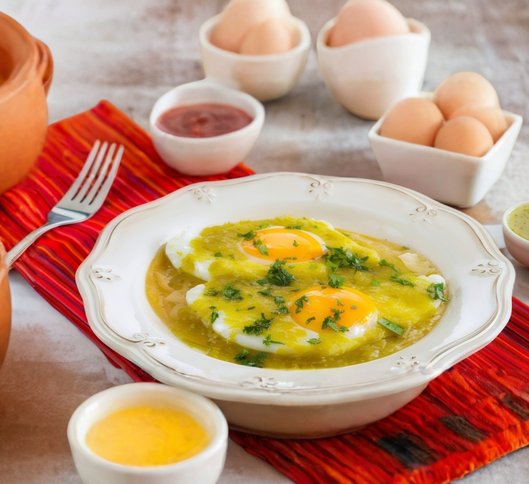 2 huevos estrellados sobre tortilla de maíz bañados con salsa verde, acompañados de papas francesas, frijolitos , pan tostado y tortillas.