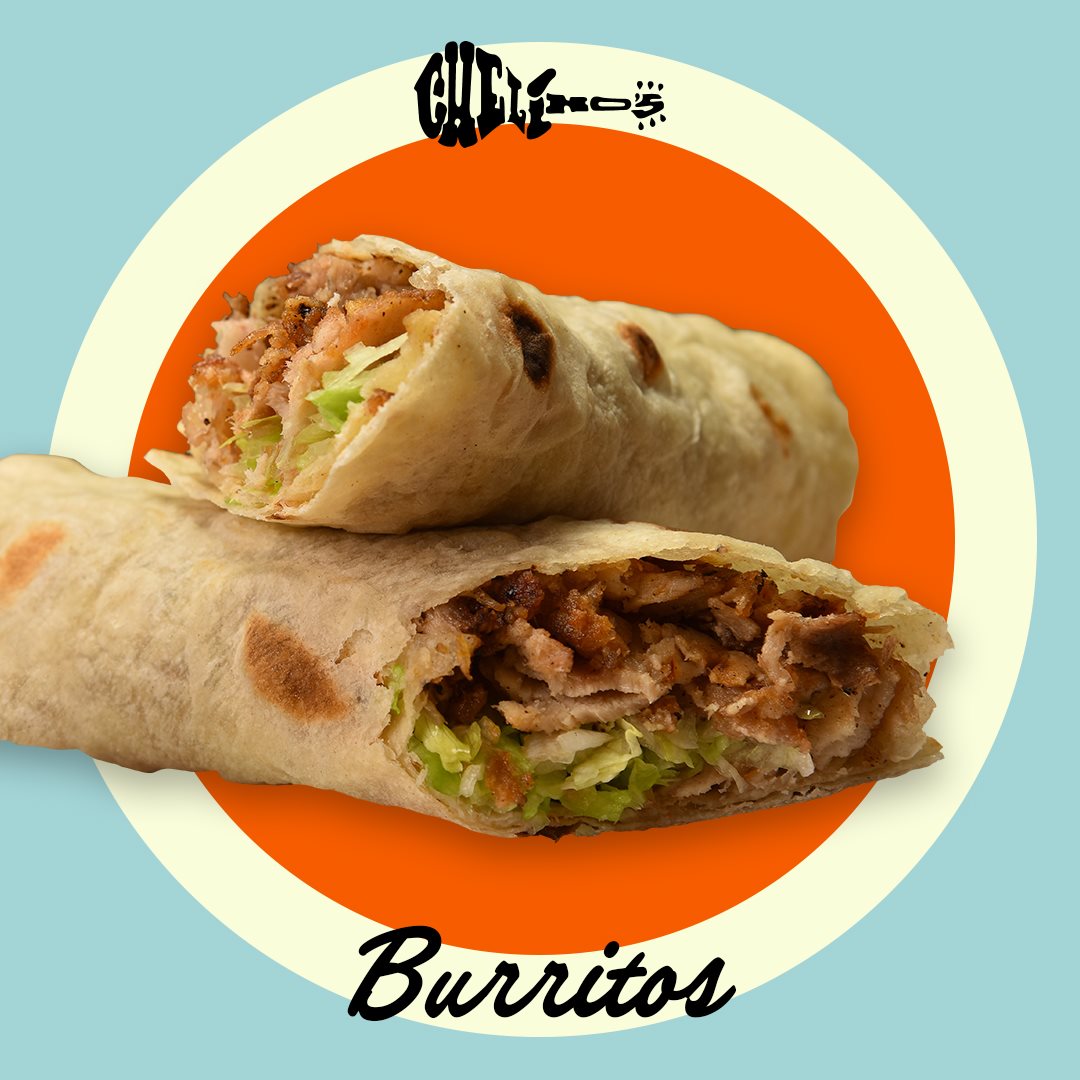 Burrito con tortilla de harina casera con carne de res deshebrada guisada con cebolla y tomate.