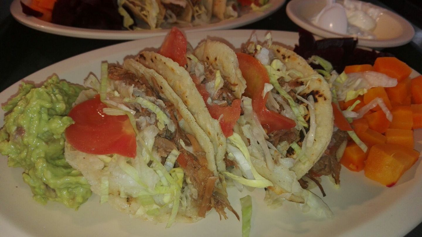 4 tacos de maíz de carne deshebrada acompañadas de guacamole, zanahoria y betabel.