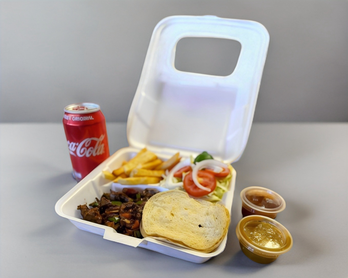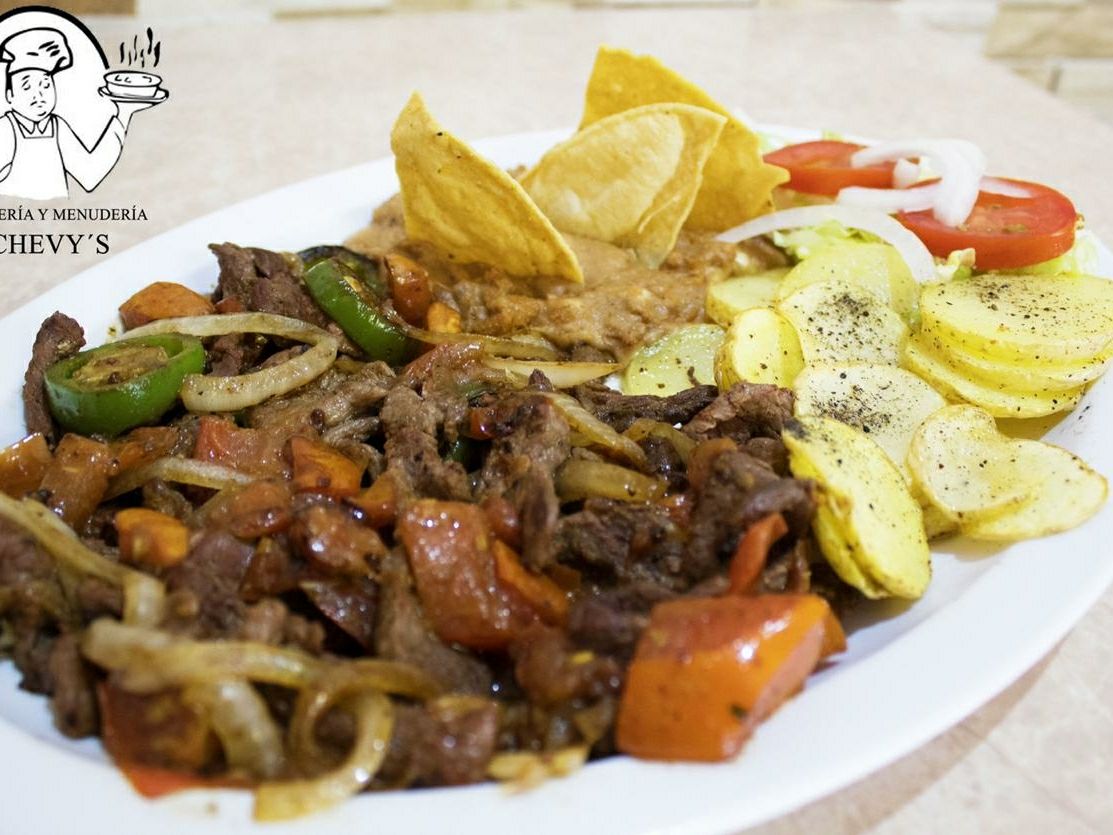180 Gramos de carne de res guisada con chile, tomate y cebolla, acompañada de papas naturales en rodajas, refritos y ensalada.