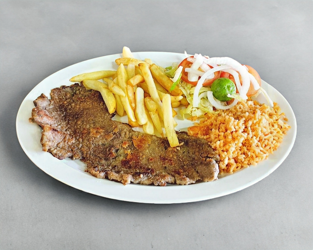 Incluye papas a la francesa, arroz y ensalada.
