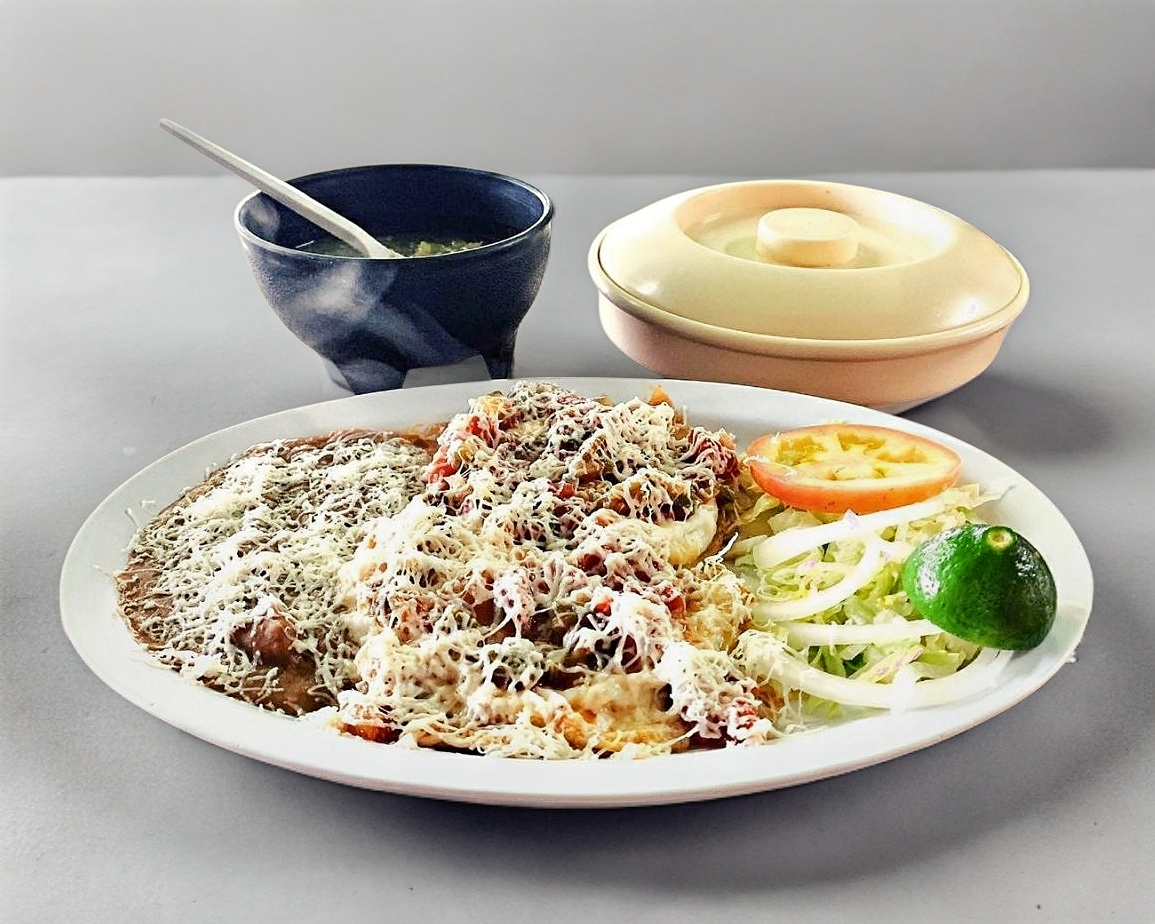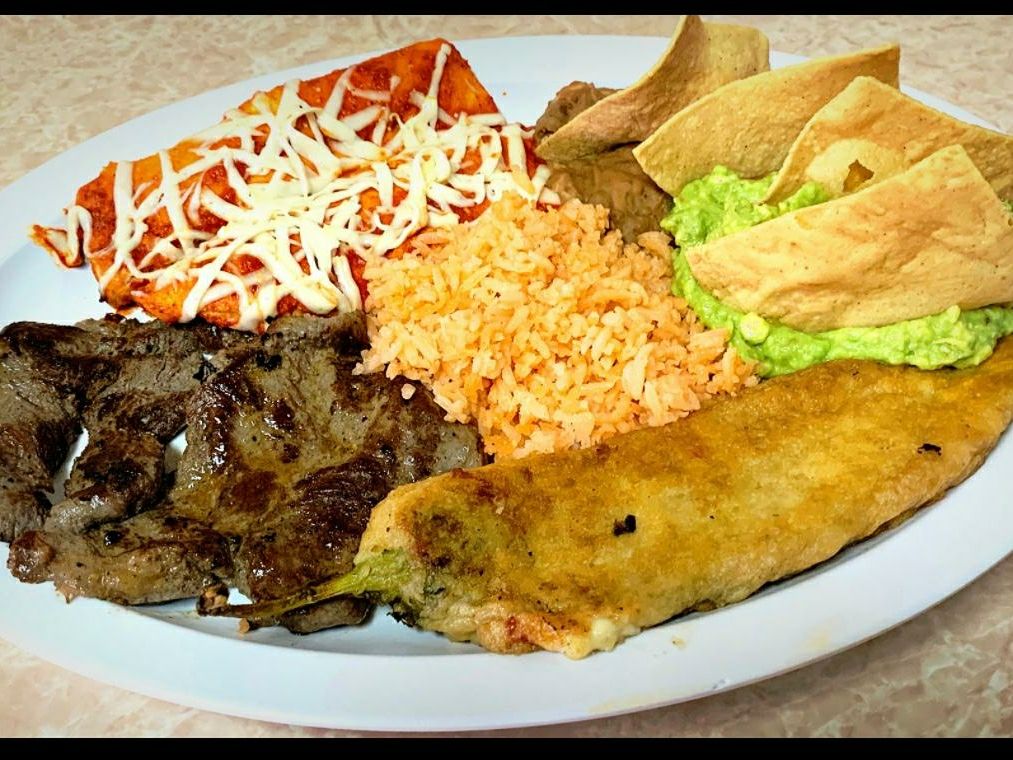 130 Gramos de arrachera, 2 enchiladas rojas, 1 chile relleno, refritos, arroz y guacamole.