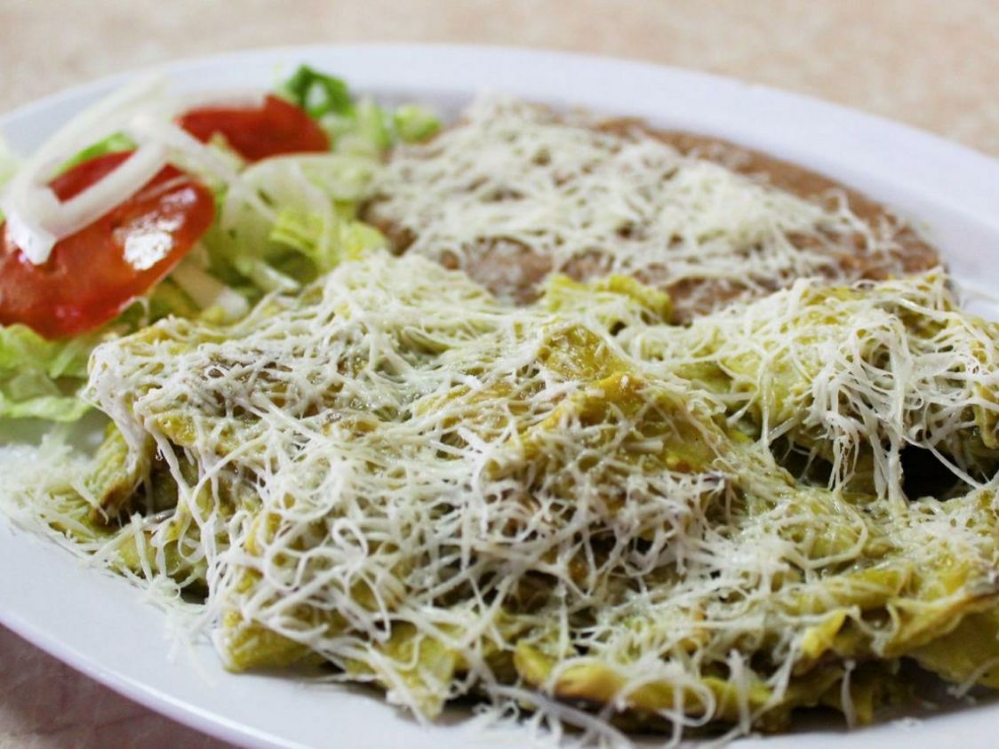 Chilaquiles verdes o rojos, frijoles y ensalada.