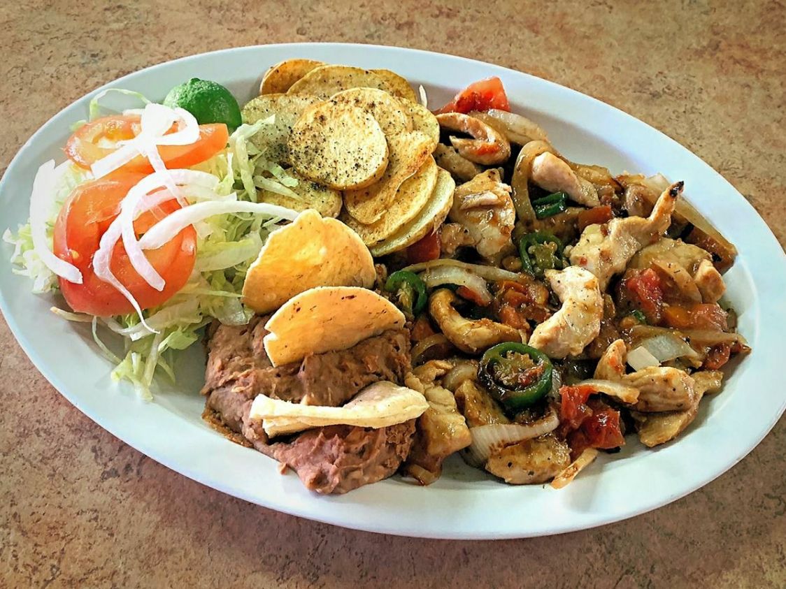 180 Gramos de pechuga de pollo guisada con chile, tomate y cebolla, acompañadas de papas naturales en rodajas, refritos y ensalada.