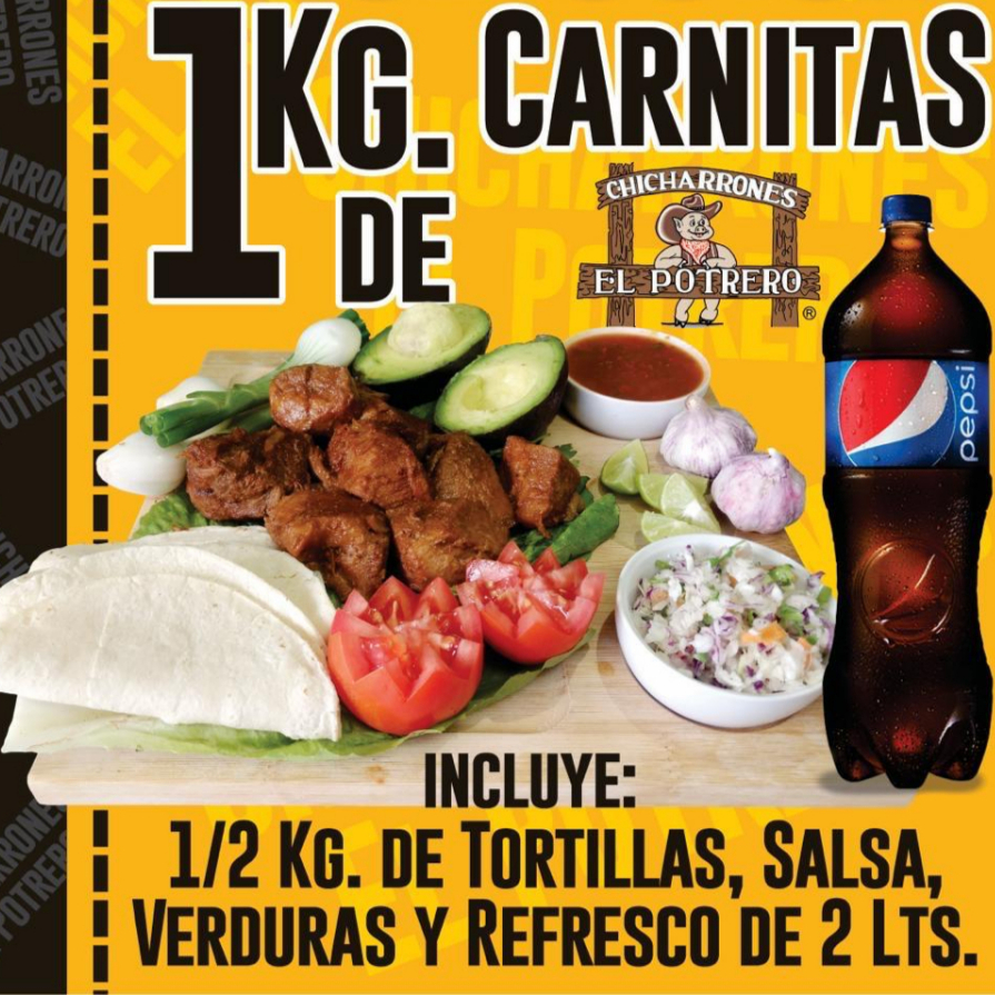 PAQUETE de 1kg de deliciosas CARNITAS acompañado con 1/2kg de tortillas, salsa, verdura (repollo, zanahoria y cilantro) y un refresco de 2.5 lts