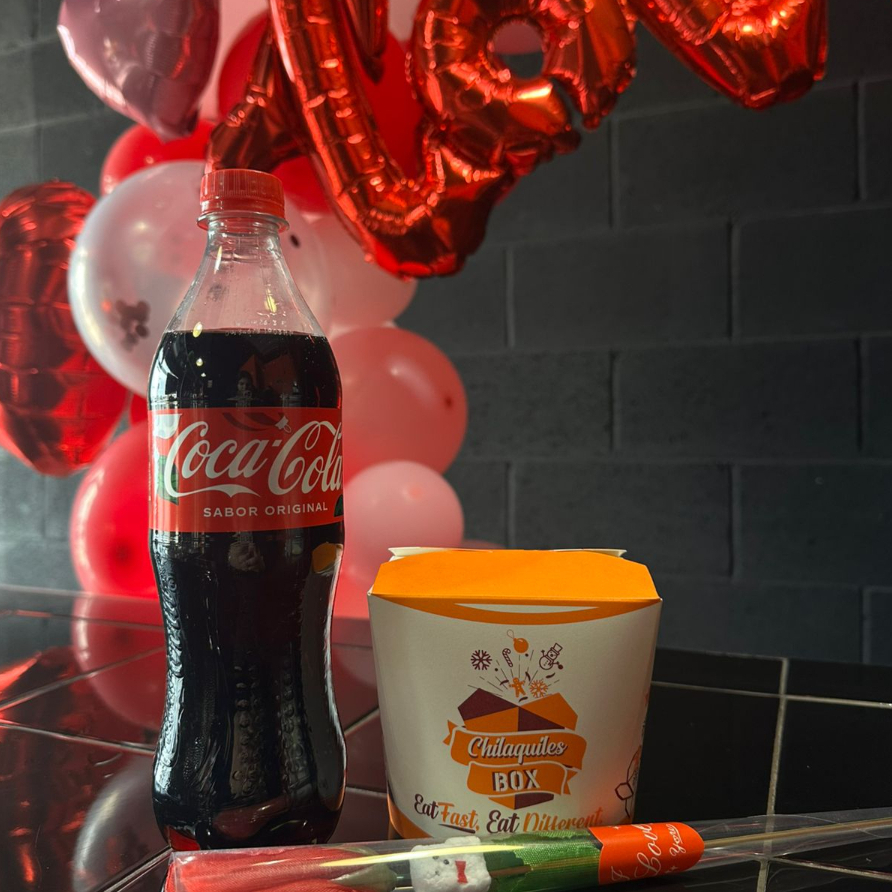 Caja de Chilaquiles*1 + Mándale una rosa y frase a esa persona especial*1 + Bebida*1