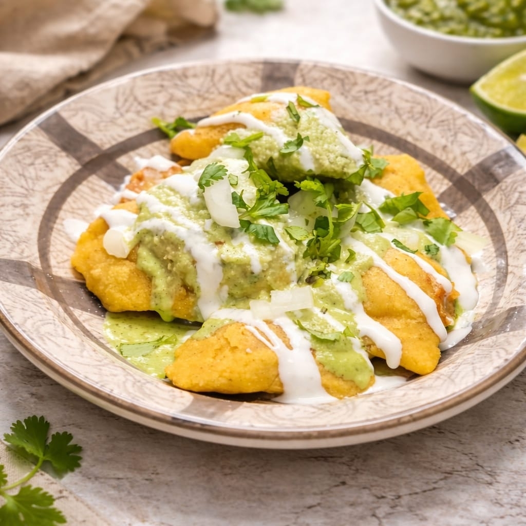 Masa de Maíz en forma de empanada rellena de Pollo frita, acompañada de crema, queso cotija y una salsa a elegir