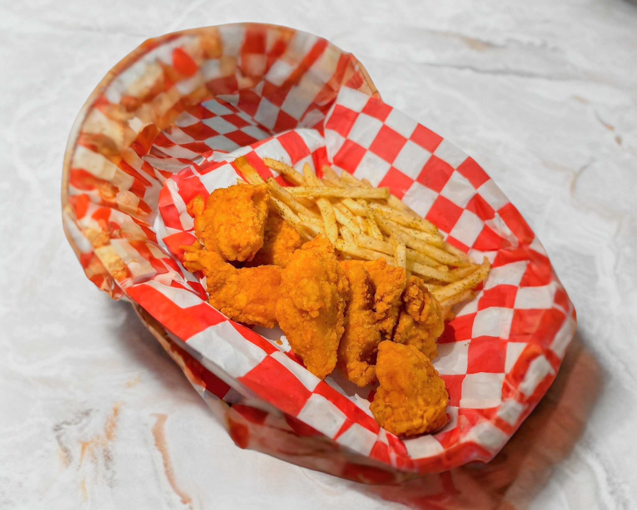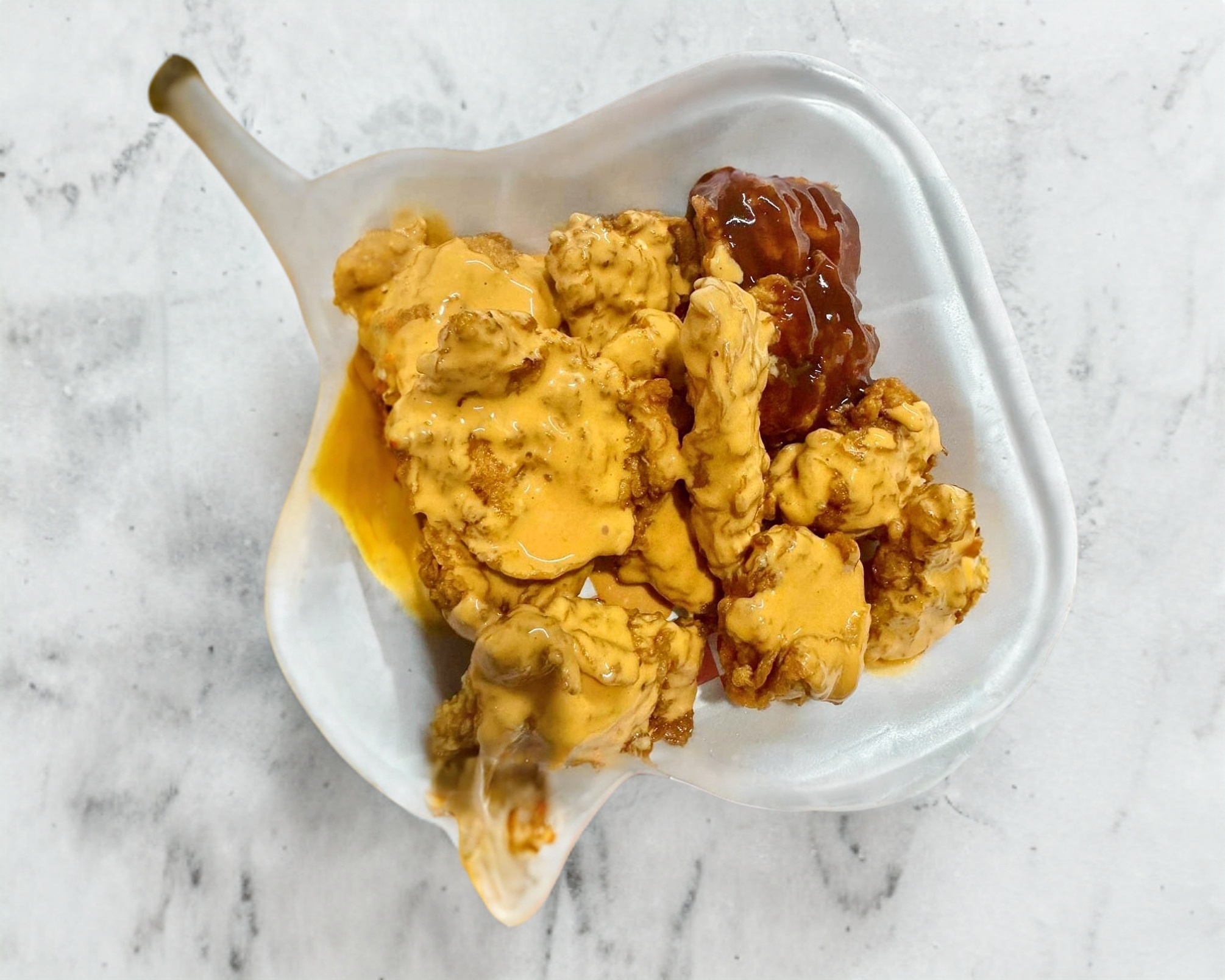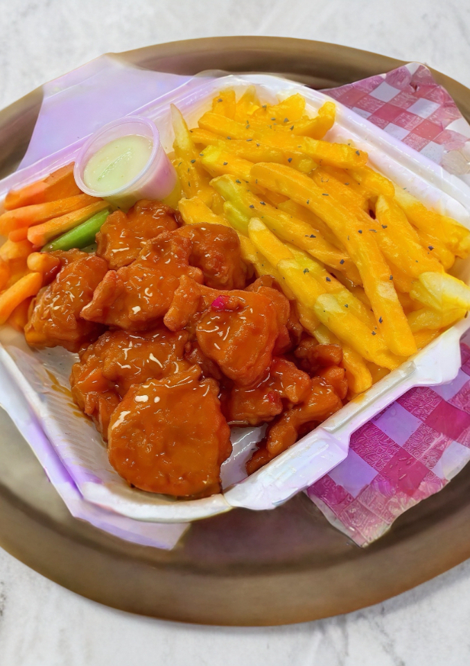 600g de Boneless bañados en 2 salsas a elegir,y papas fritas topinng ranch y capsup.