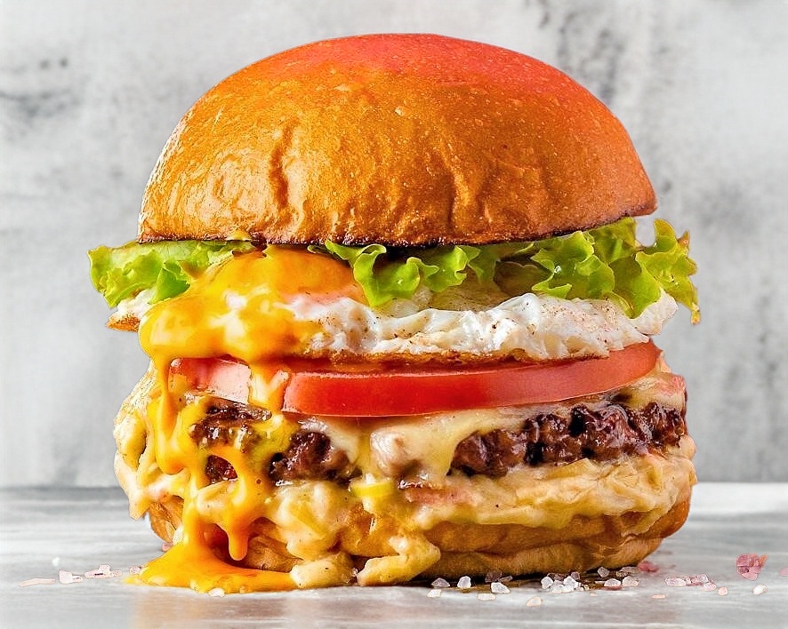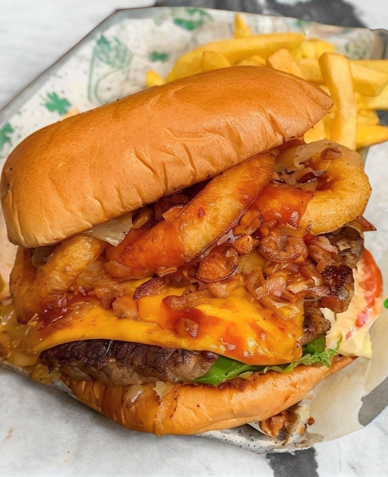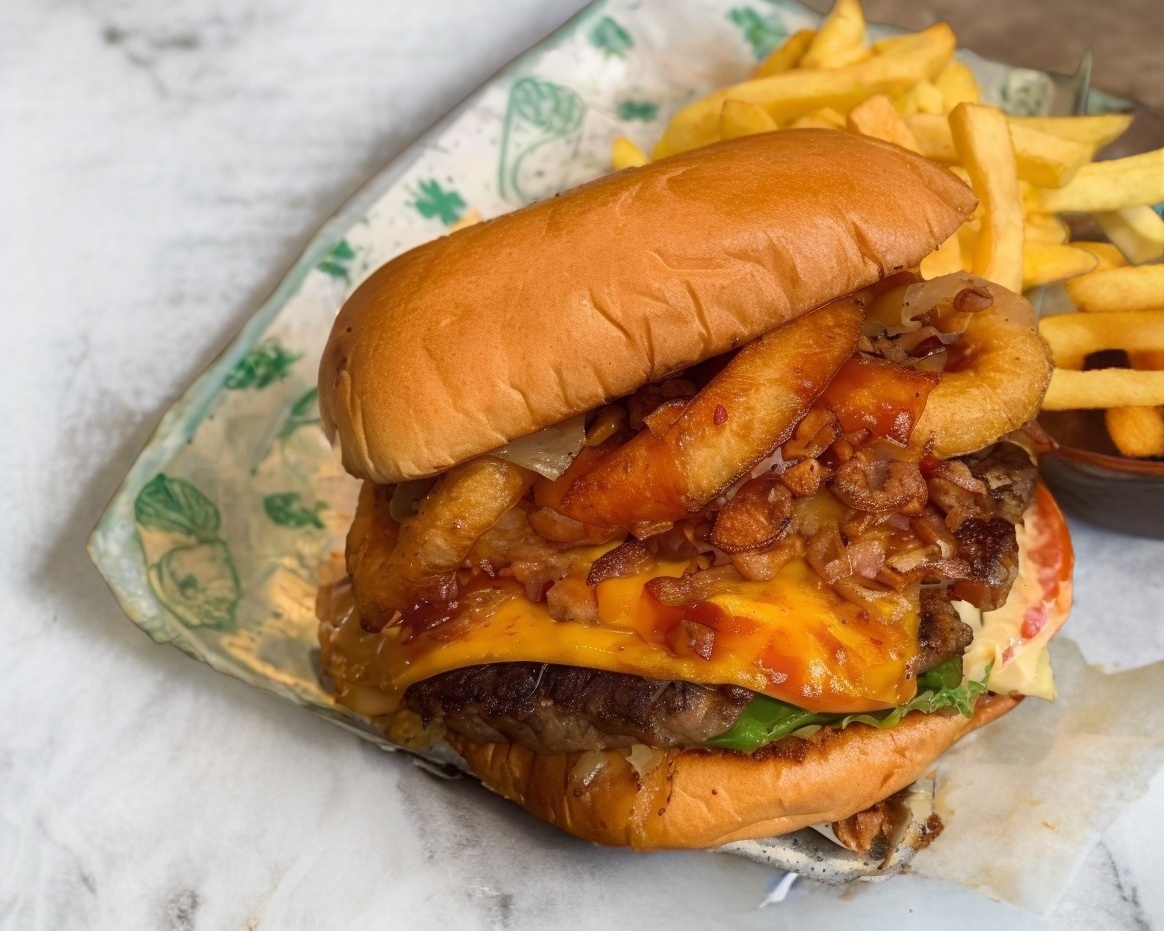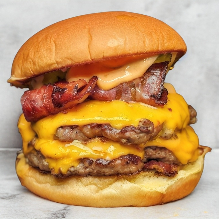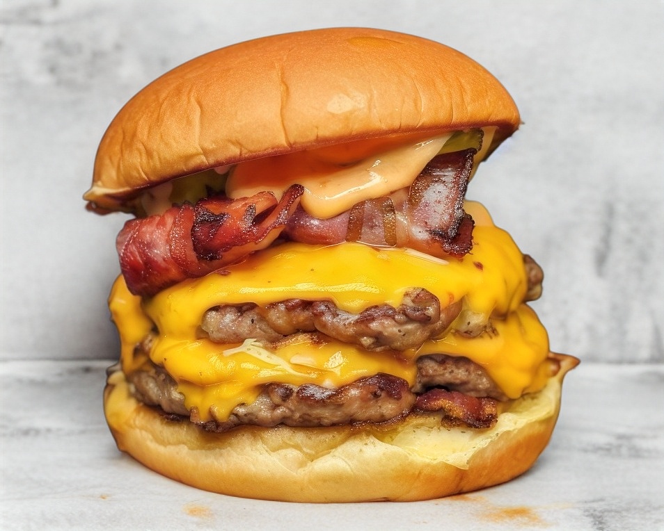 Pan normal, dos carnes de res bañadas en queso amarillo y tocino, un aro de cebolla, lechuga. Tamaño grande.