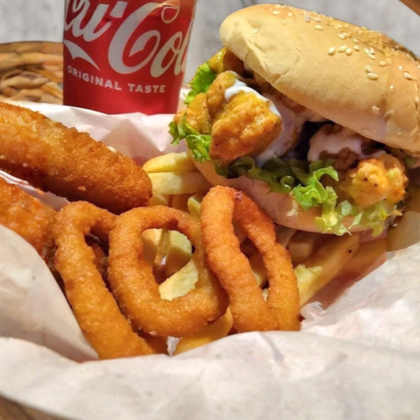 Hamburguesa boneless y aros de cebolla.