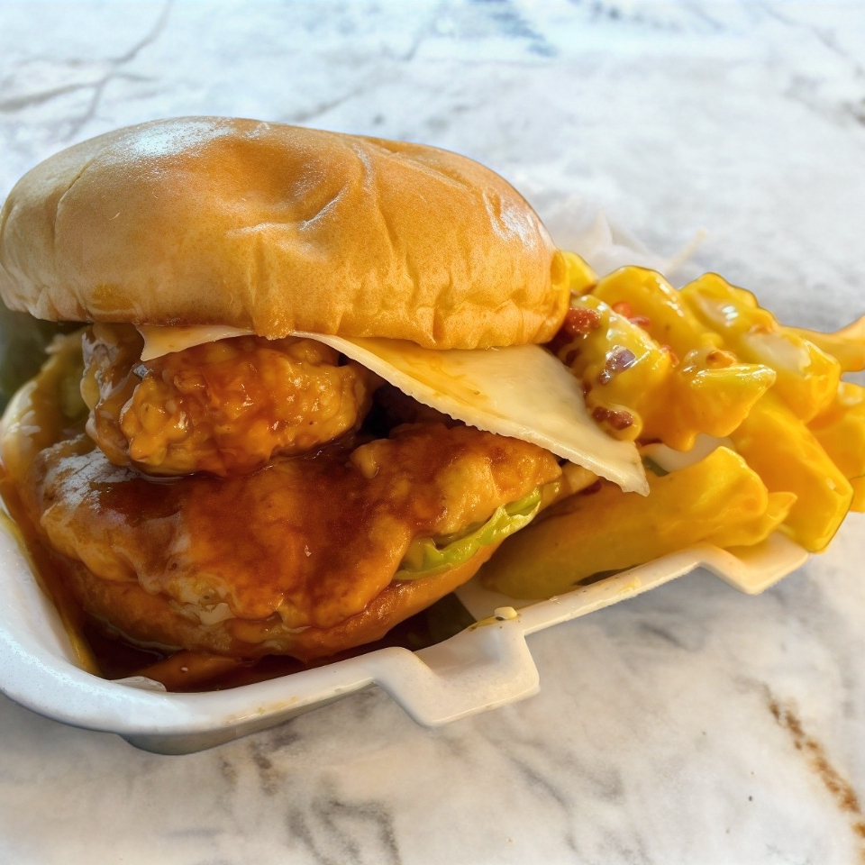 Hamburguesa boneless en tu salsa favorita y porción de papas con queso ‼️ topinng ranch