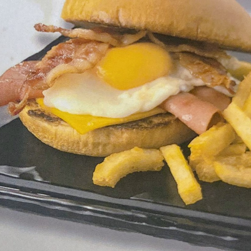 Pan de hamburguesa, queso amarillo, aguacate, huevo y tocino. Porción de papas fritas. Topping catsup.
