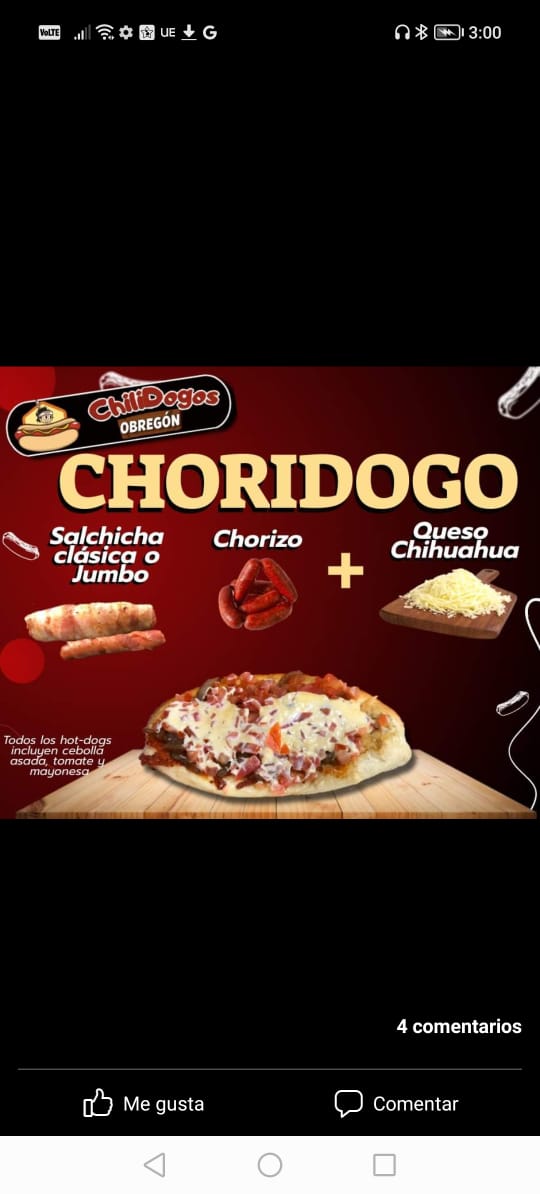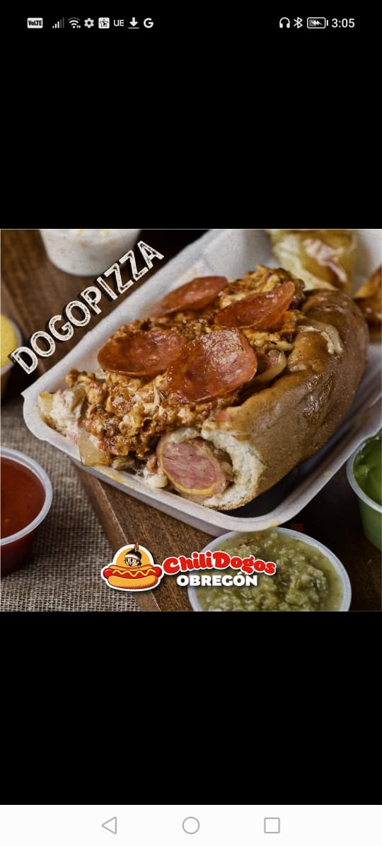 Salchicha jumbo, chorizo frito, pepperoni, queso Chihuahua, salsa para pizza y mayonesa.