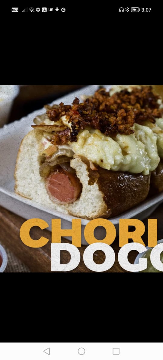 Pan tradicional d sonora, salchicha d pavo envuelta en queso amarillo jamón y tocino, chorizo frito, queso chihuahua, cebollita caramelizada, tomate y mayonesa
