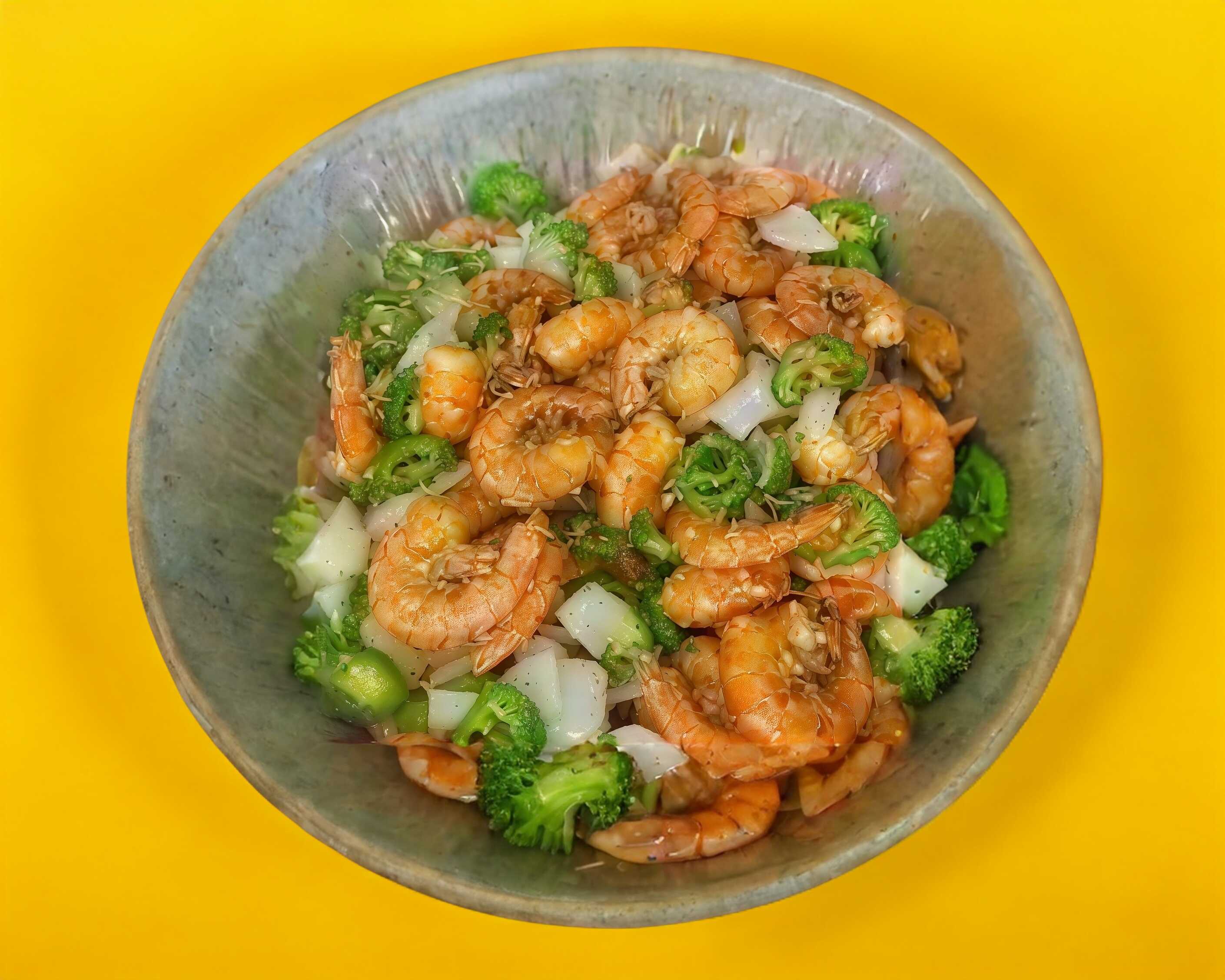 Porción individual de camarón en chile de árbol y cebolla.