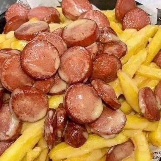 300 Gr. de papas fritas, acompañadas de rodajas de salchicha de hot dog, bañadas con 4 oz. queso de nachos tipo cheddar.