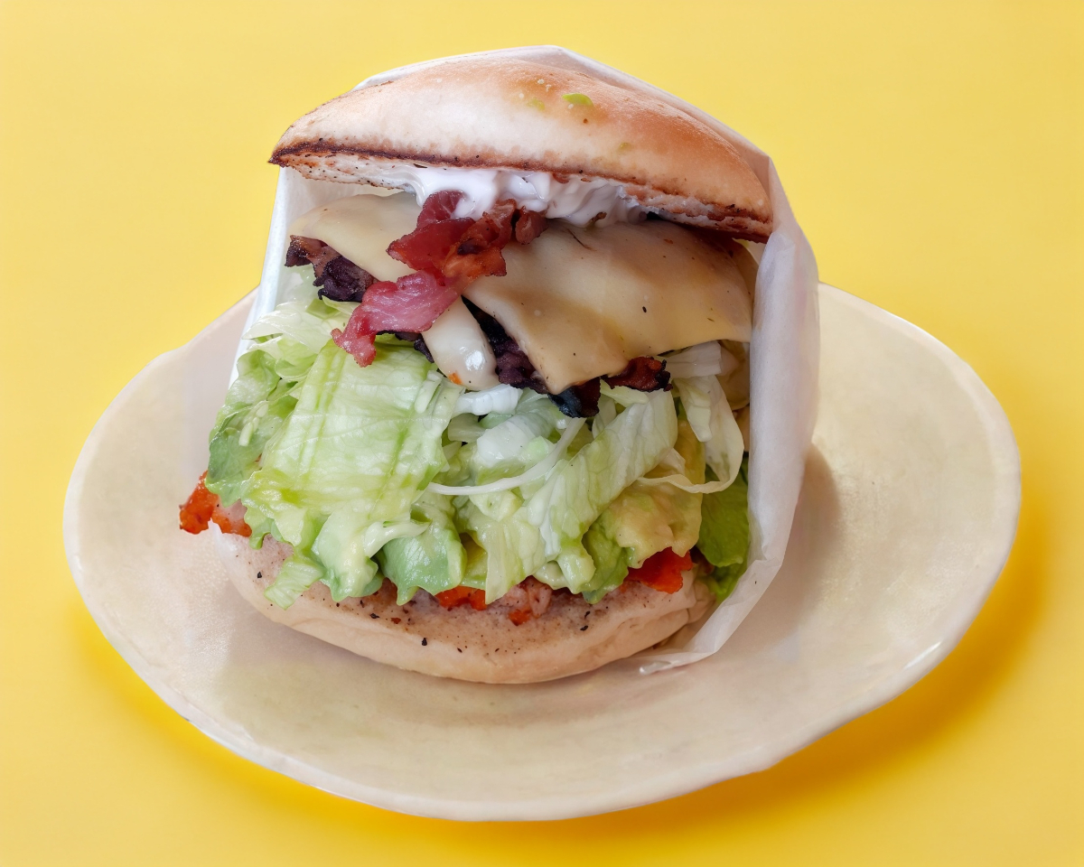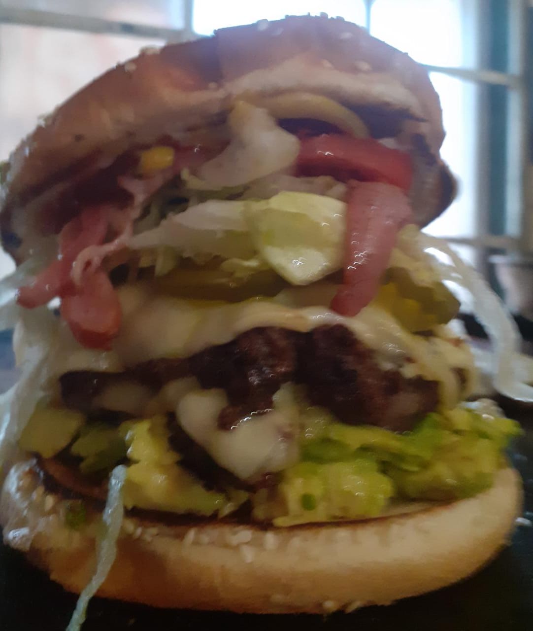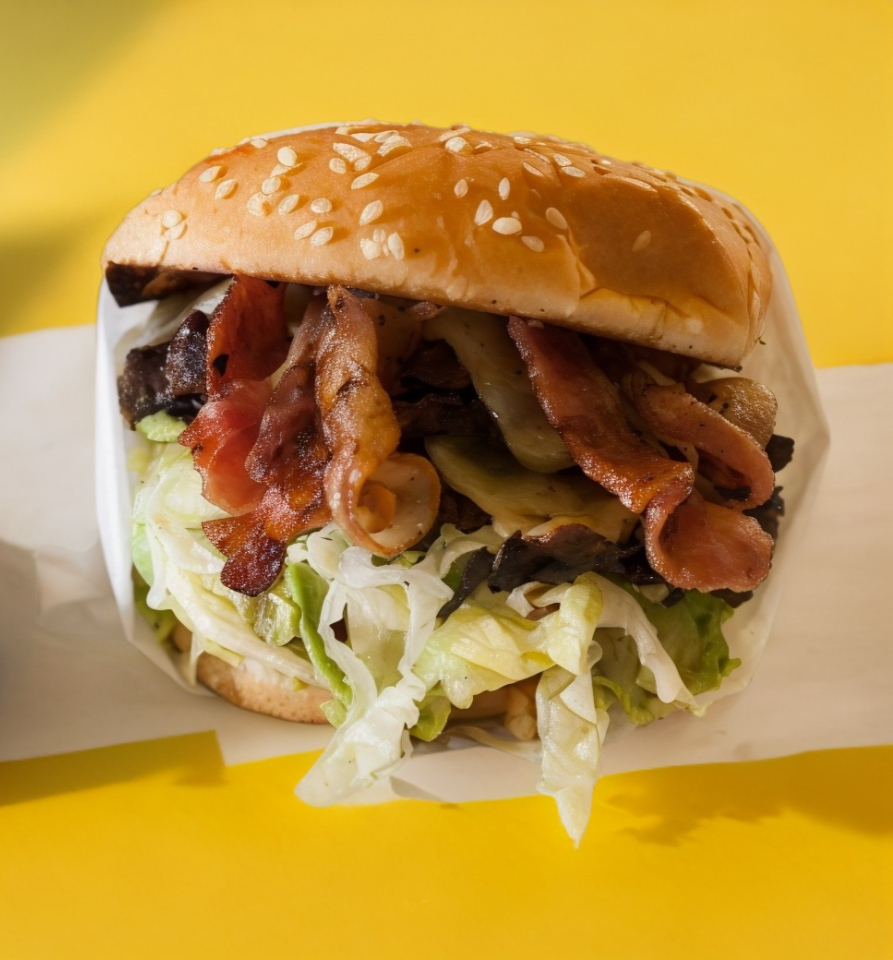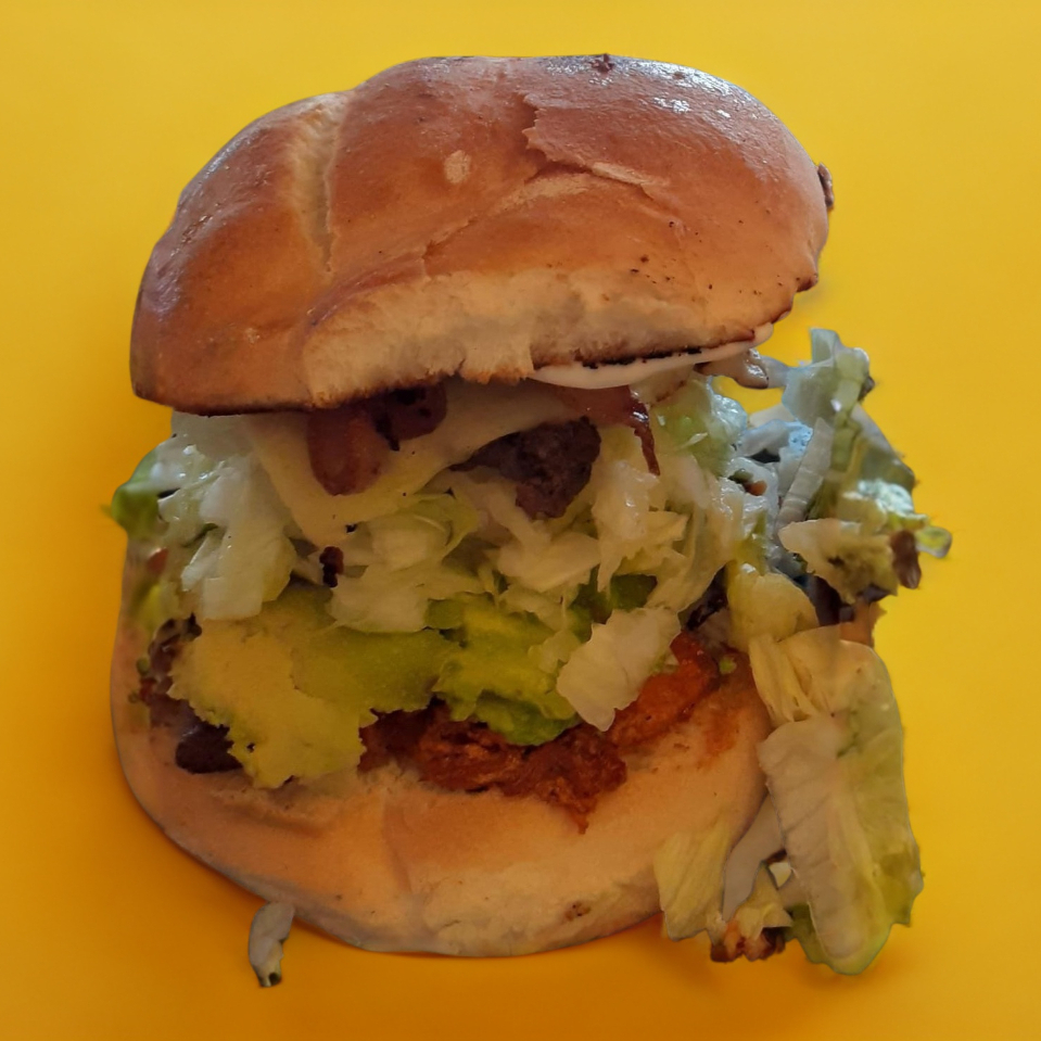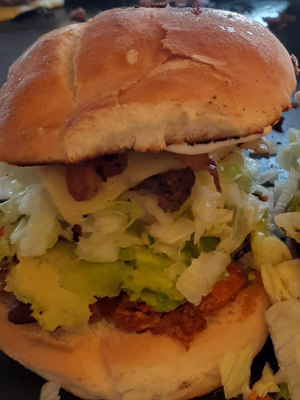 Doble carne, queso, tocino, verdura, aderezos y aguacate.