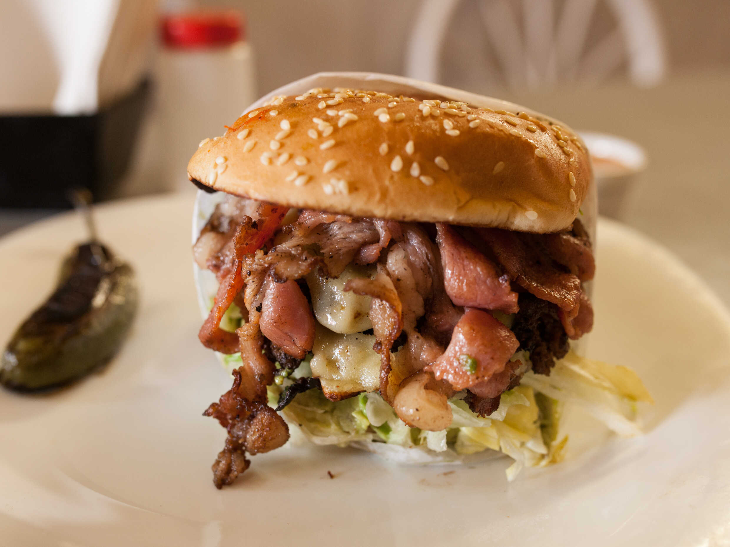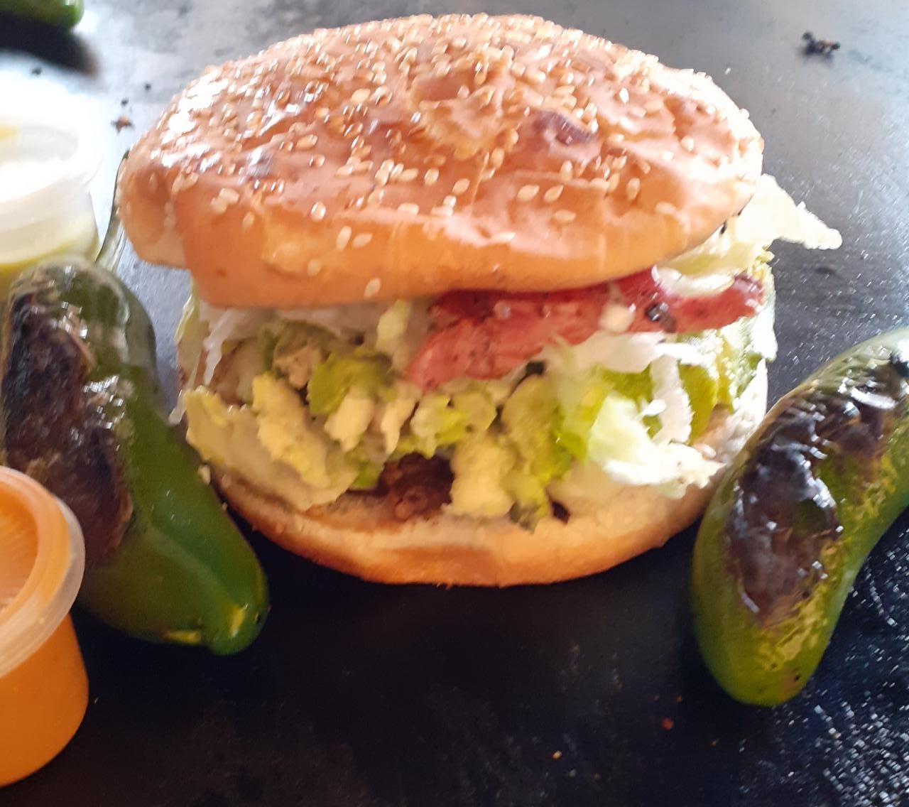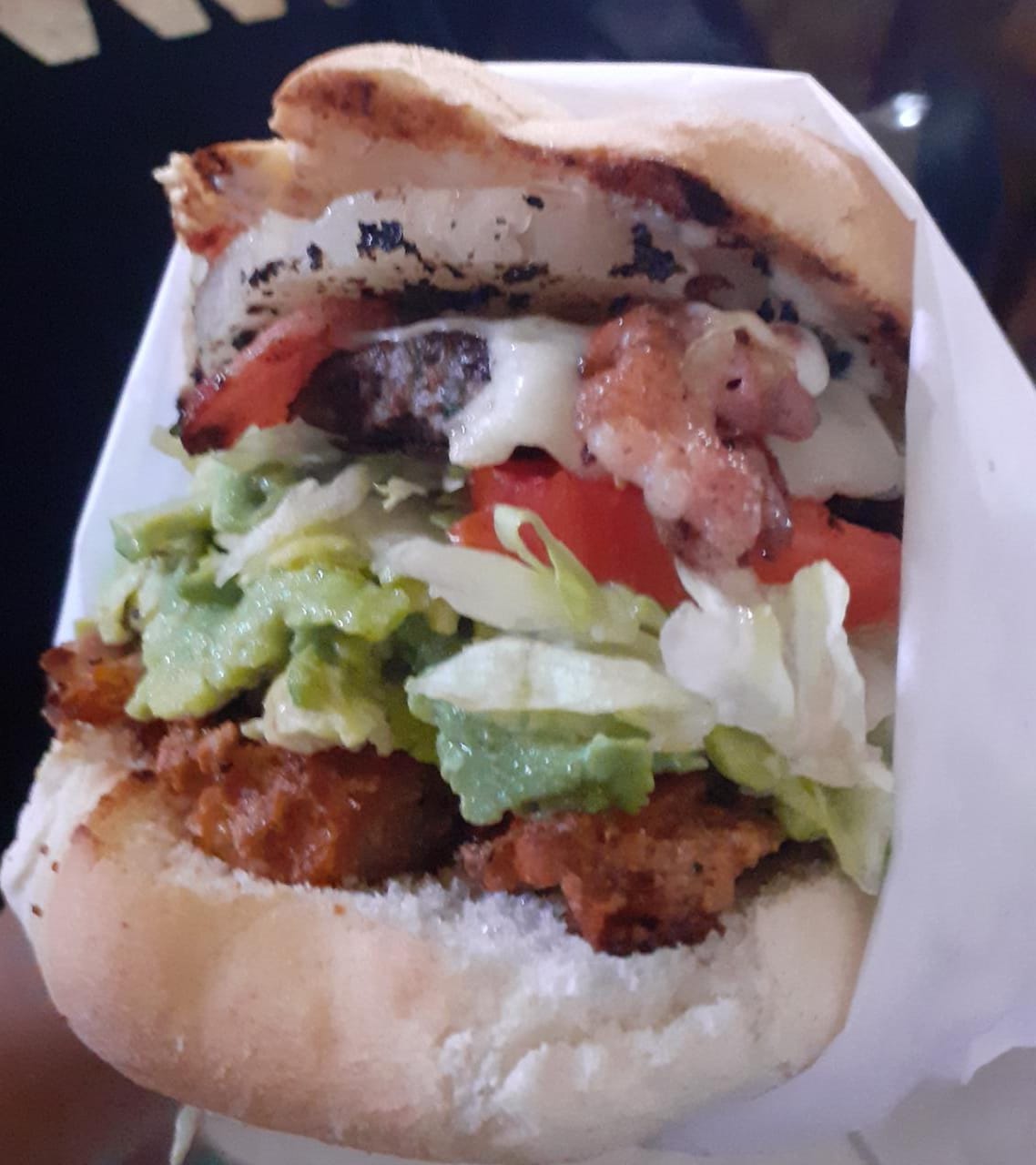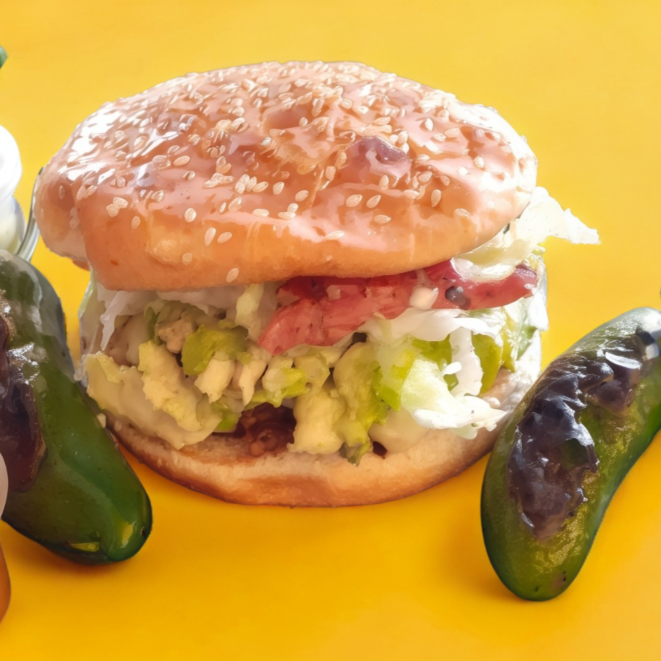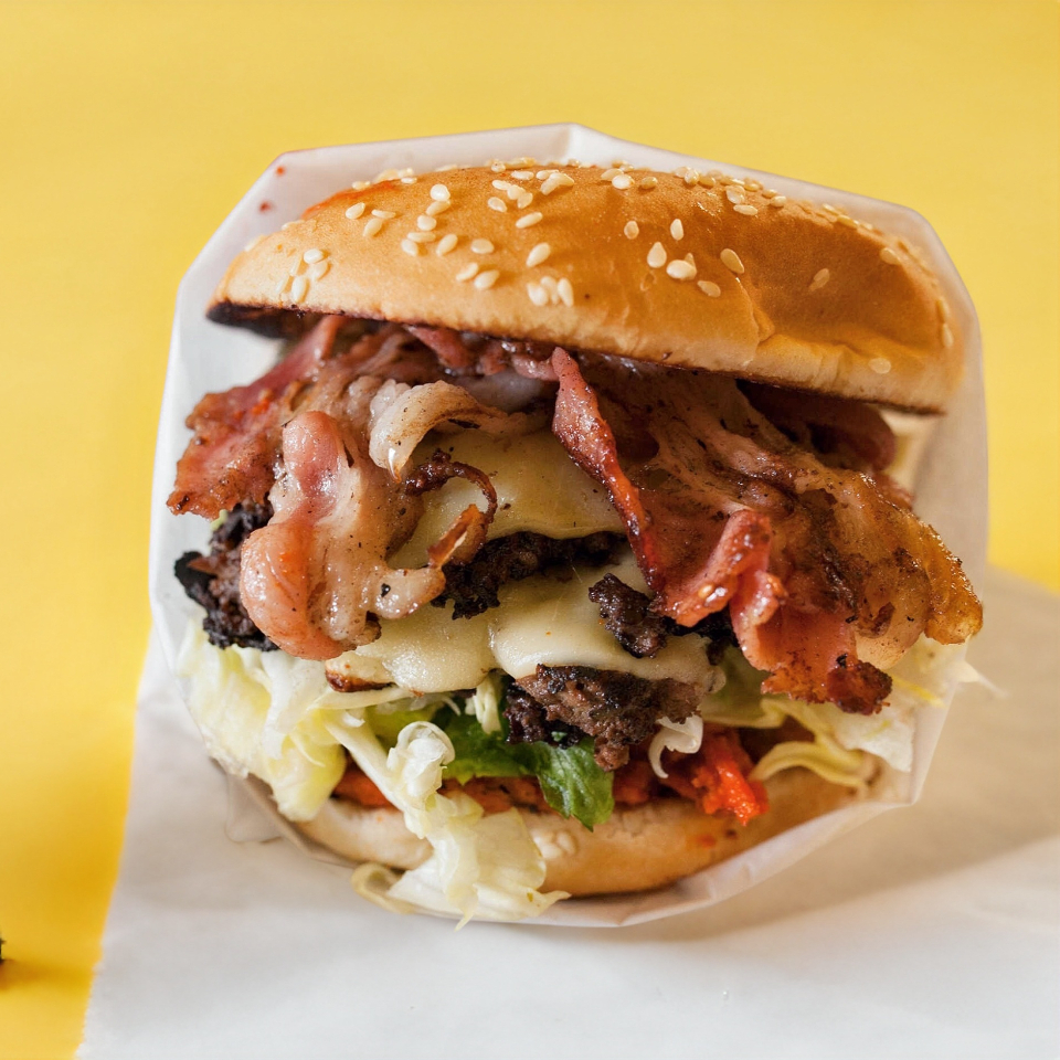 Doble carne, queso, tocino, verdura, aderezos y aguacate.