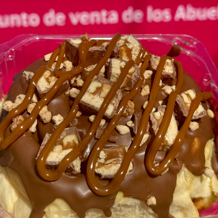 ROLL INDIVIDUAL CON BASE DE CHOCOLATE OBSCURO, CACAHUATE DULCE Y DULCE DE LECHE.