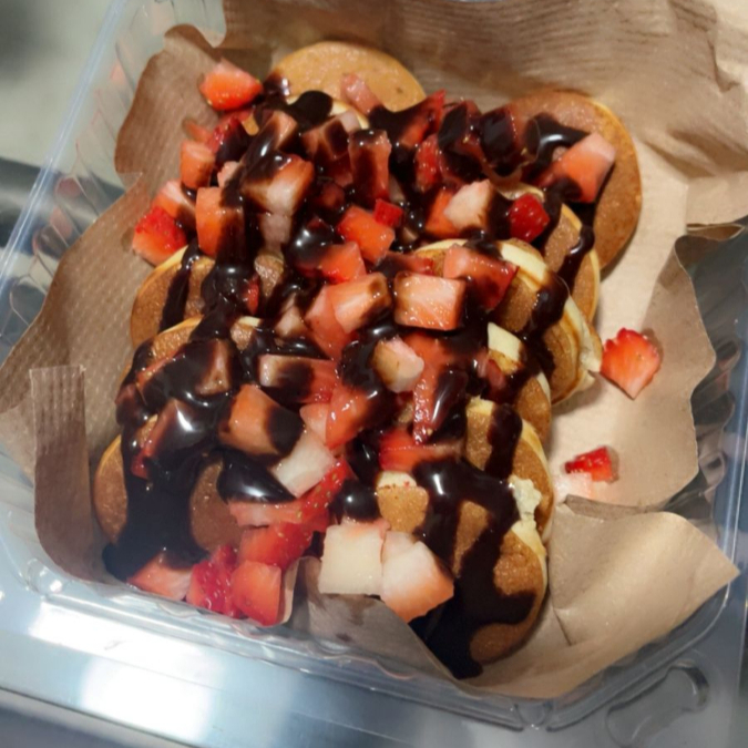25 piezas de mini hotcakes bien calientitos preparados con los toppings de tu preferencia