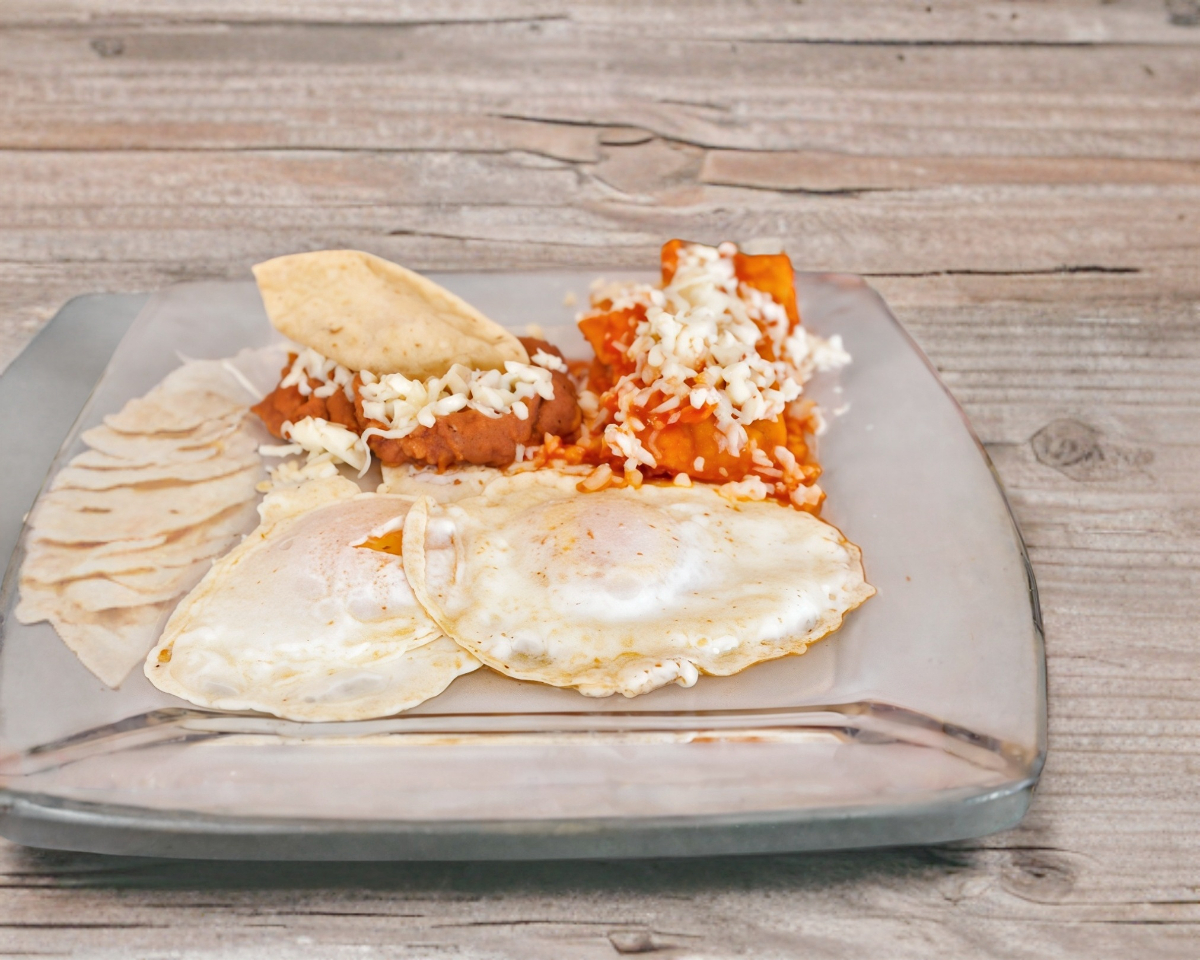 2 Huevos Estrellados con yema a elegir, bien cocida o yema liquida, 2 tortillas doraditas bañadas en salsa.