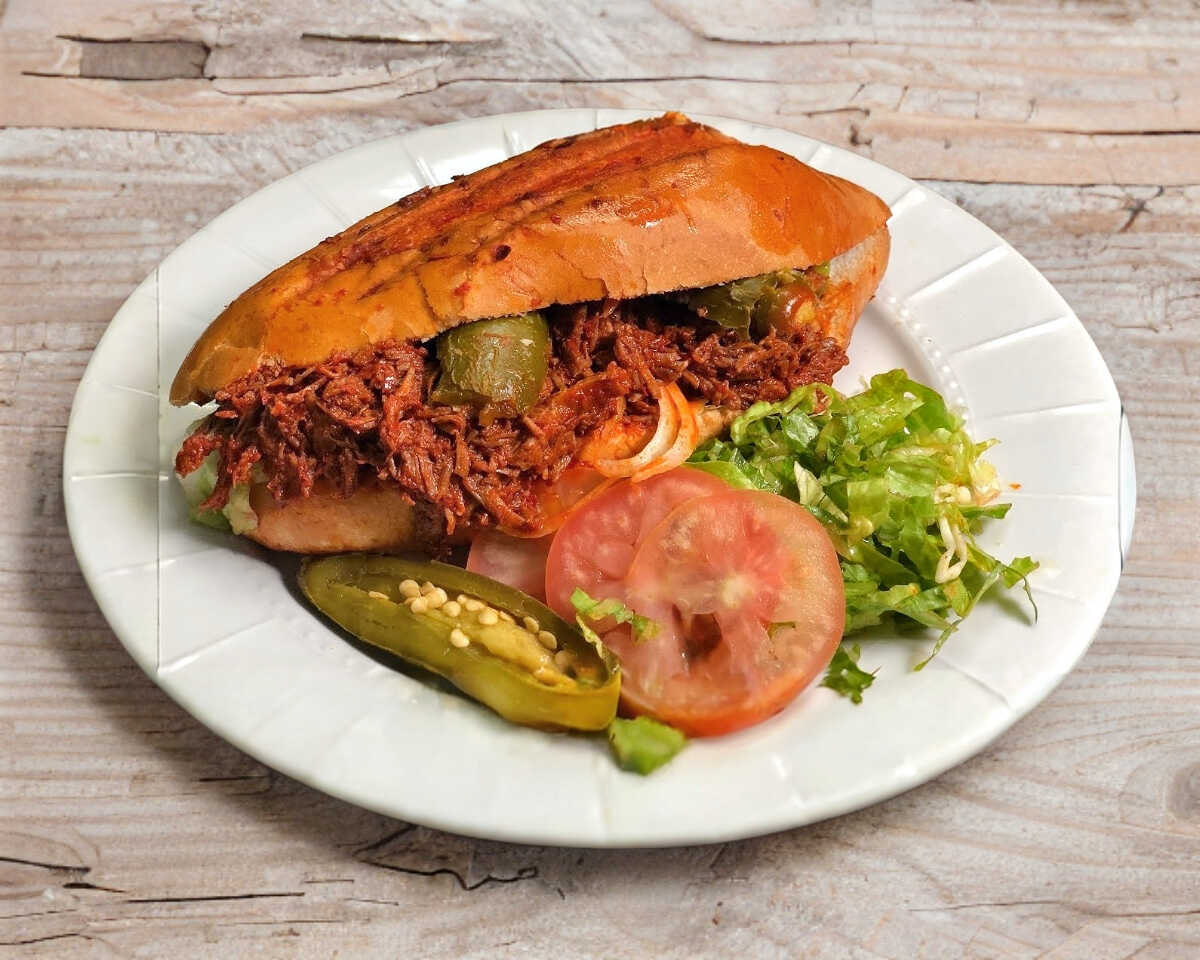 Lonche de Deshebrada de Res en Salsa Roja